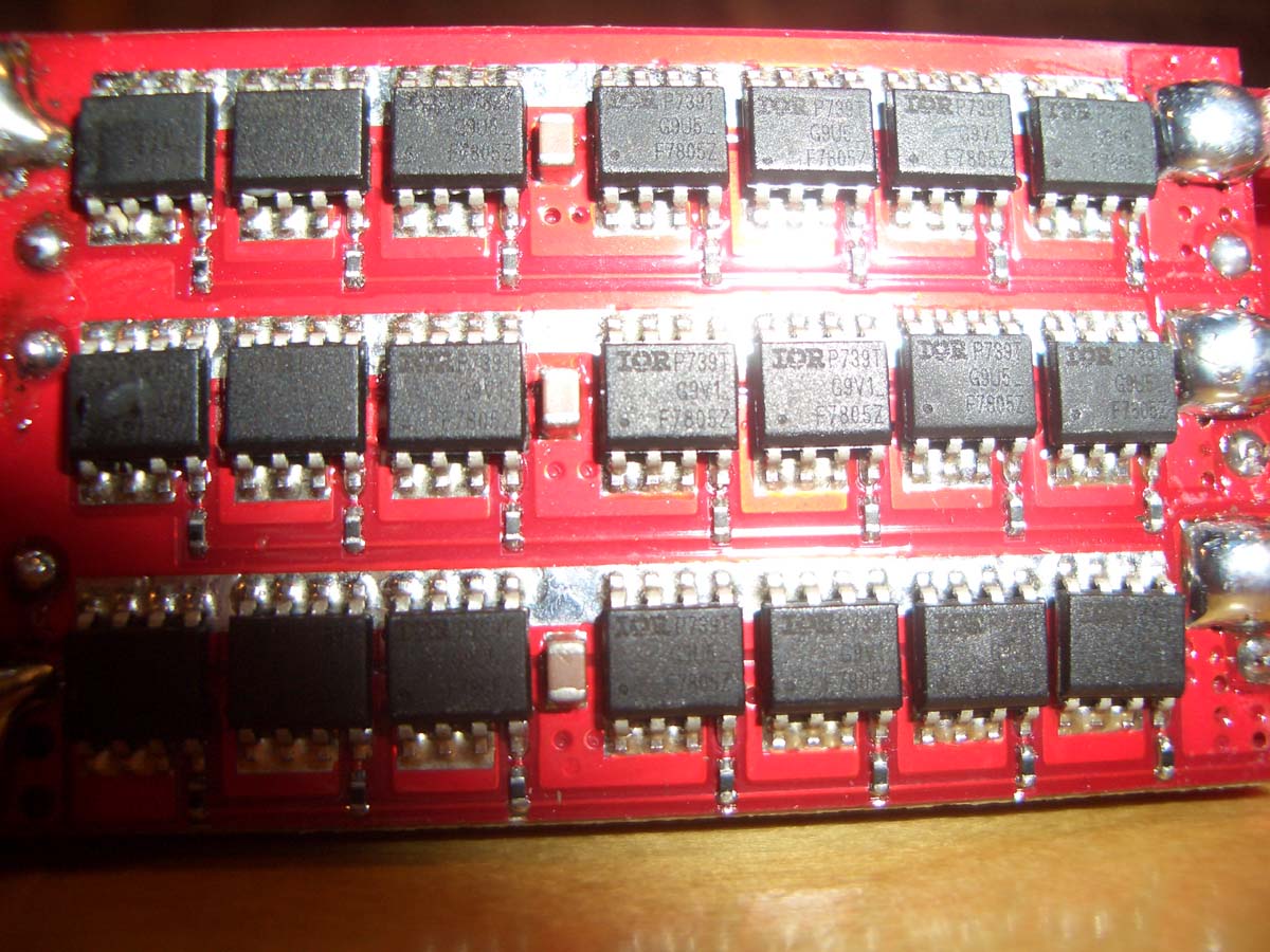 Ang. feilsøking på HexFET'ene så er det virkelig problematisk p.g.a. at de er koblet i parallell og delt opp i tre grupper. (alle inngangene er koblet sammen og alle utgangene er koblet sammen innenfor hver gruppe)