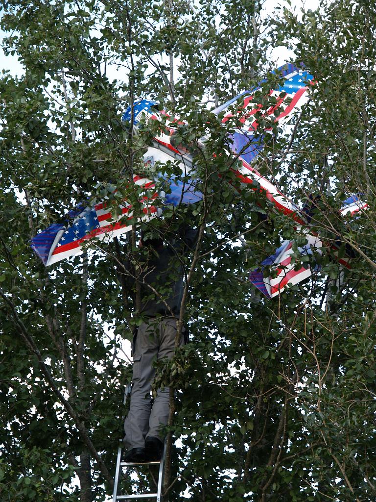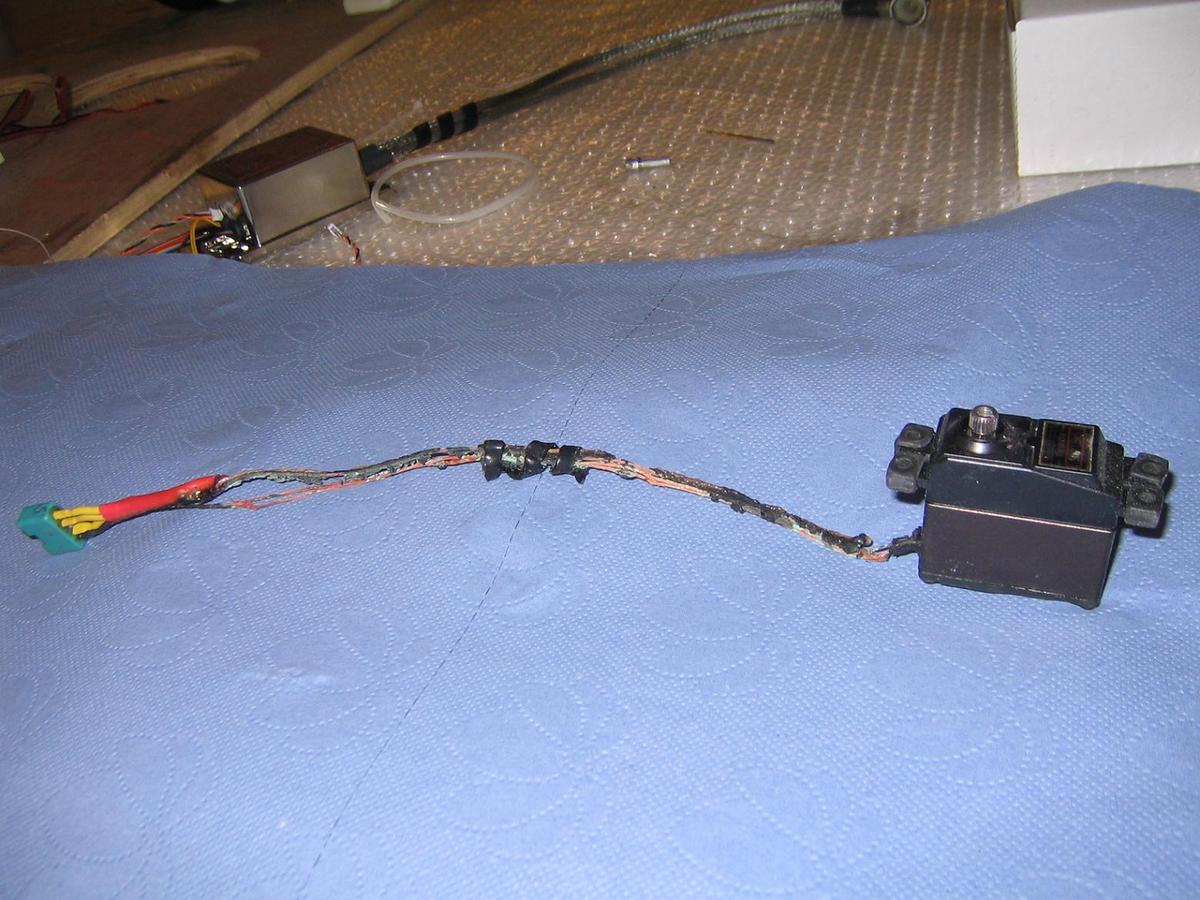 Skadene begrenset seg til et "lite" hakk i høyrevingen og noen oppbrente servoer. Flyet hang på rorene på høyre side. Skikkelig uling i servoene. Men det ble da stille etter hvert. Klarte ikke å komme til bryterne.