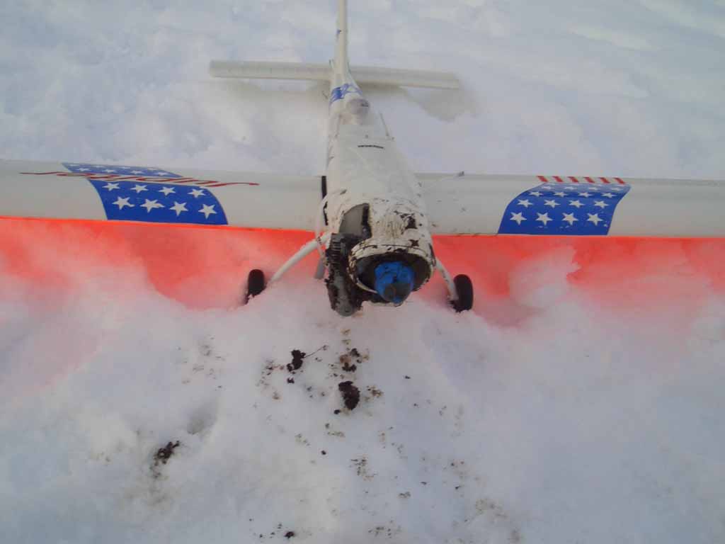 skulle bare ta en liten ettermiddagstur med e-starteren på påskesnøen her sørpå. satte på vingen og skrudde i mutteren og tok av og dro godt til værs. skulle så legge inn første sving, men ingenting skjedde! balanserora reagerte ikke! klarte nesten å redde flyet ned med sideroret, men da jeg ikke er så vant med ren siderorflyging ble det en skikkelig nesestyver ned i bakken fra ca 3 meters høyde på slutten. reiv av flottørene og bøyde propelladapteret litt, tror ikke motorakslingen ble bøyd. utrolig nok ble ikke motorfestet revet opp, bare litt snø inni cowlingen.