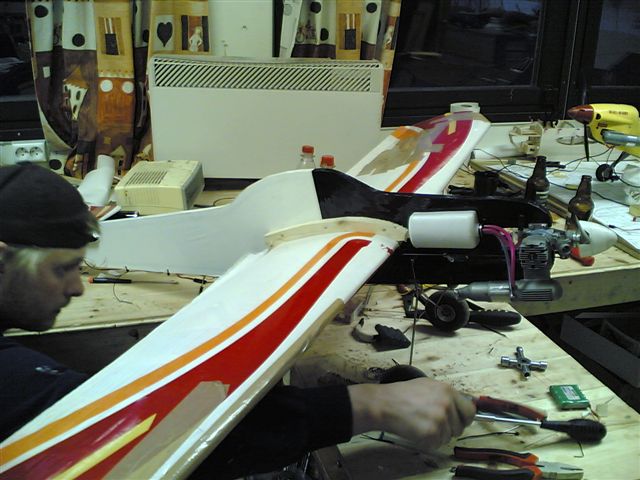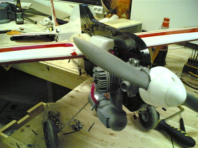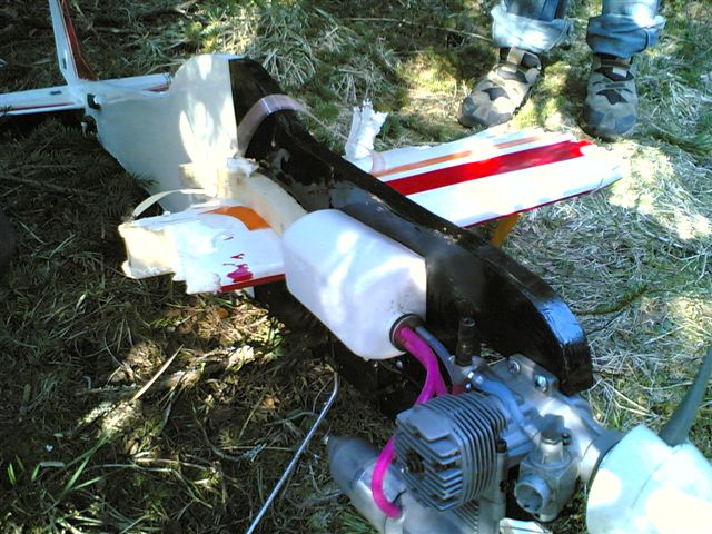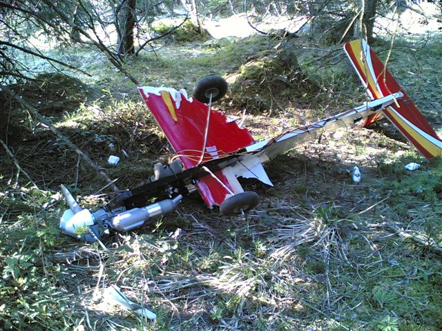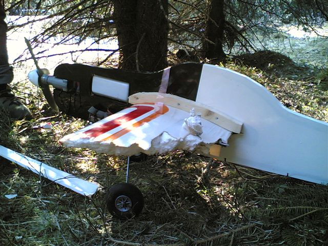På kort tid slengte jeg og en kamerat sammen ett fly bestående av en 15 mm forskalingsplate til kropp, en gammel trainervinge, og høyde- og sideror fra samme trainer. Grunnet lite planlegging ble det tyngre enn forventet, -men det fløy! Men etter ett minutt virket ikke høderoret lenger, og turen endte i skogen. Der ble vi overrasket over bjørkefinerens panserbrytende egenskaper! Noen som vet om gran kan føle smerte..? Vingene ble effektivt skrellet av, men kroppen var like hel!