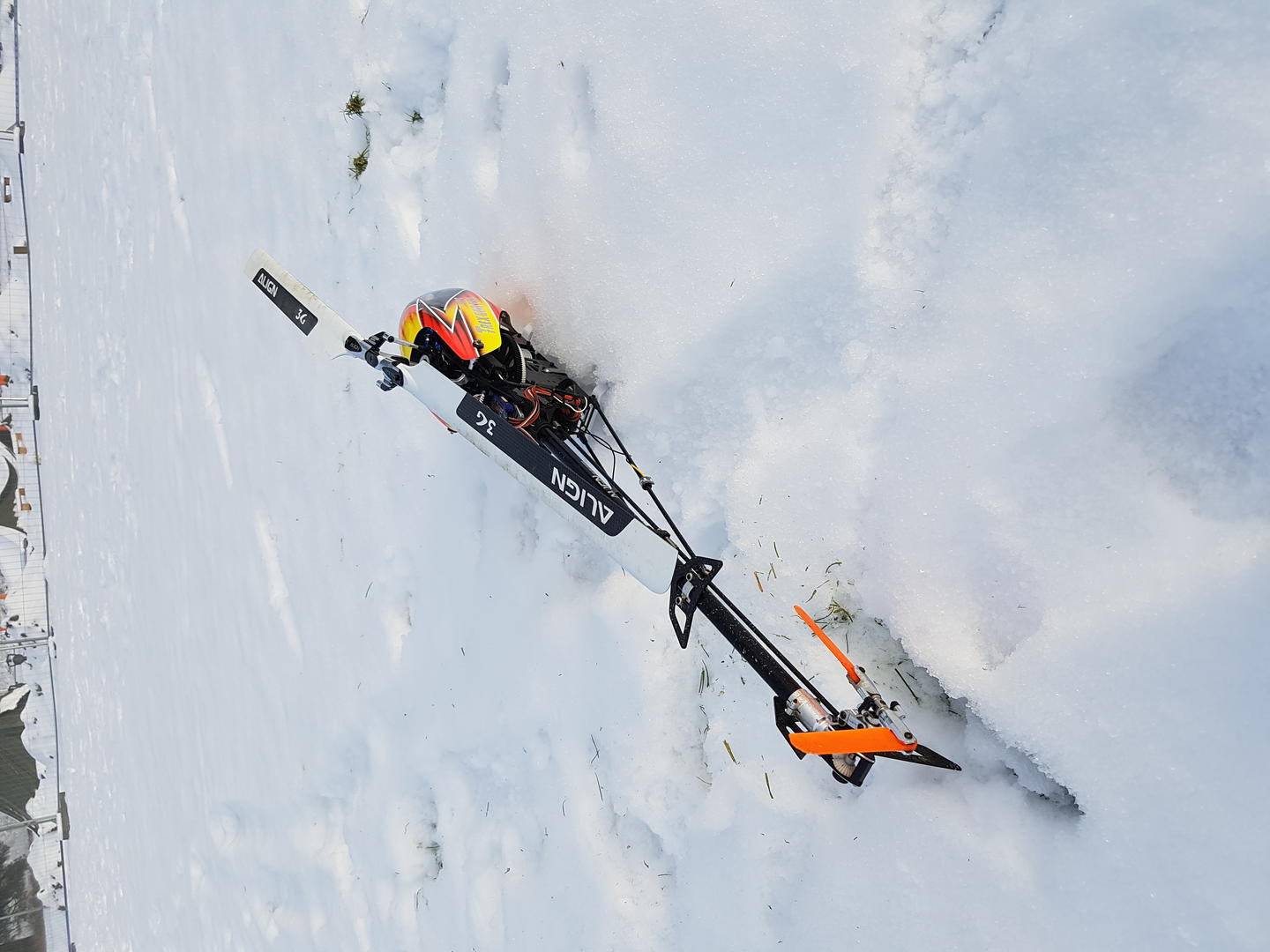 Det var visst ikke så lurt å autorotere på snø, Men jeg fikk brukt halen som snøfreser da.