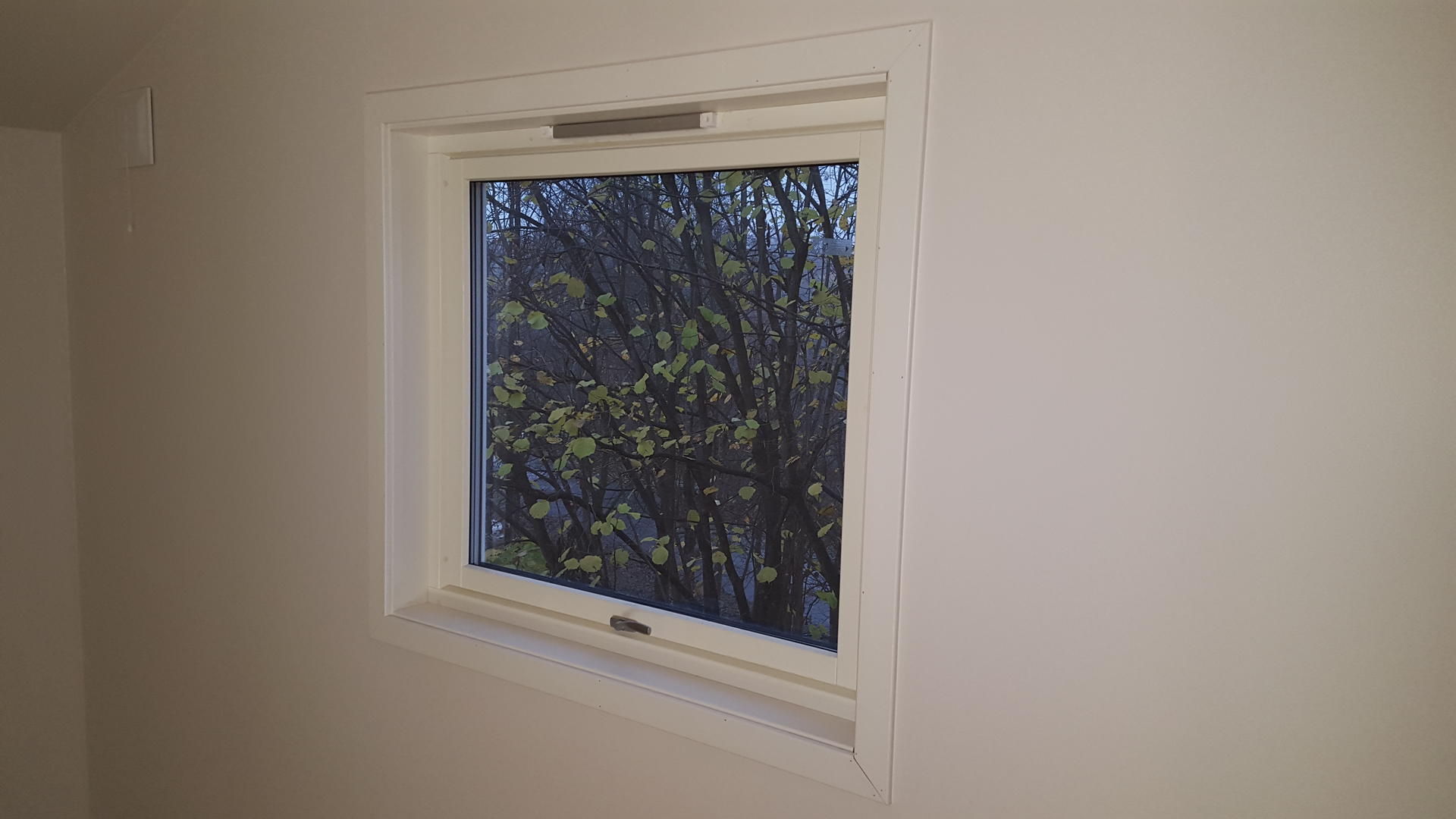 Vindu er fått lister og utforing. Listingen kunne vært bedre, men er jo bare et verksted.