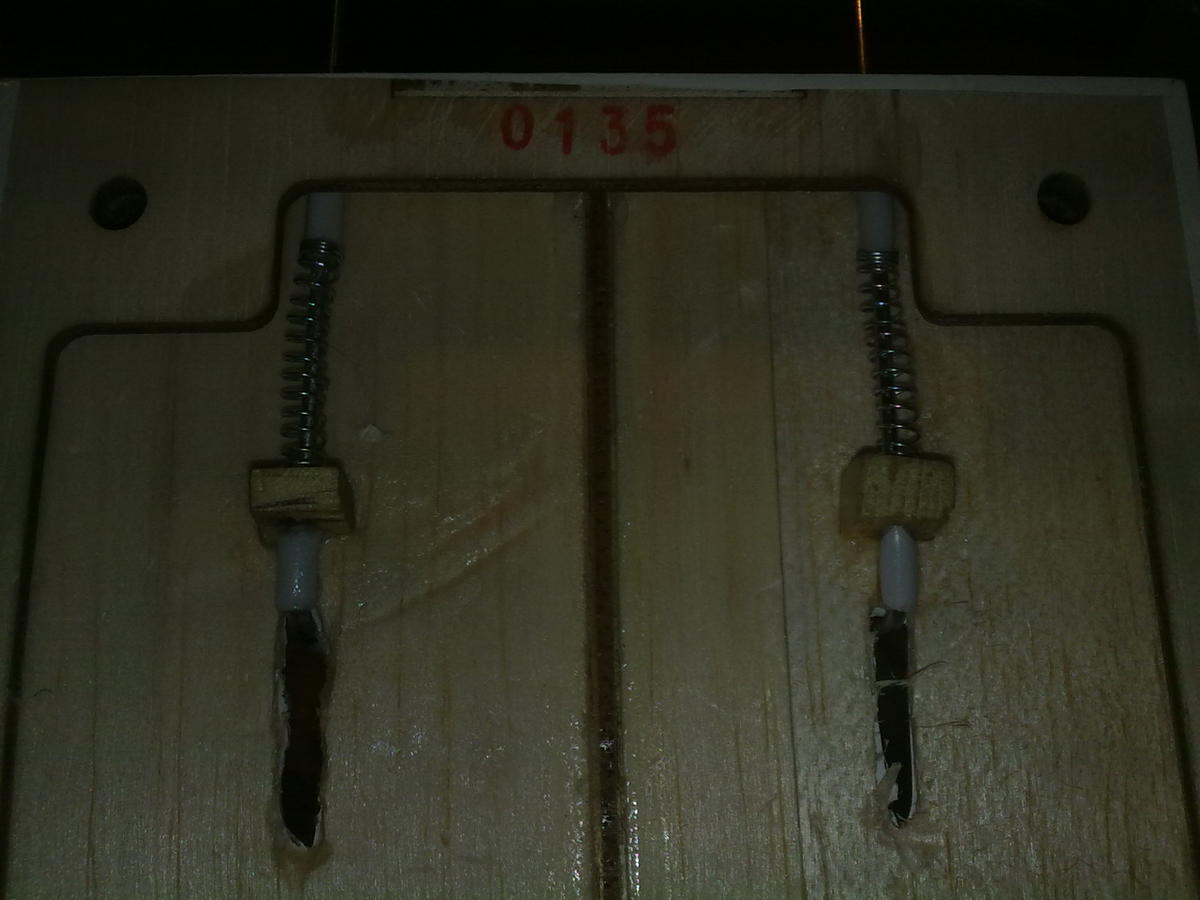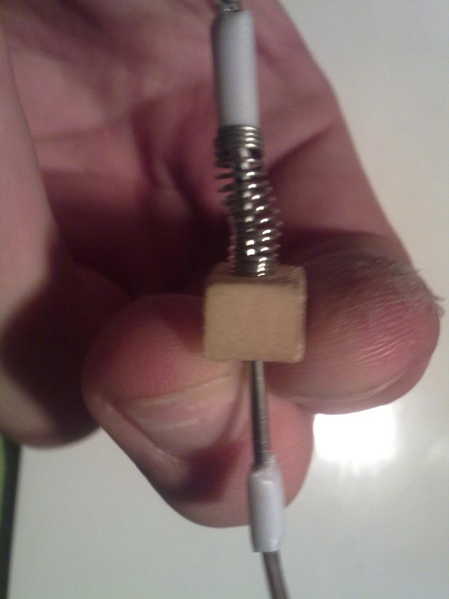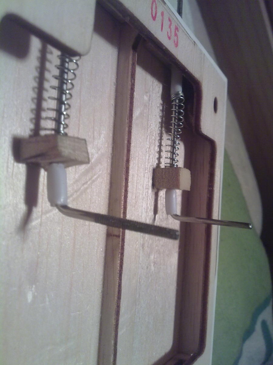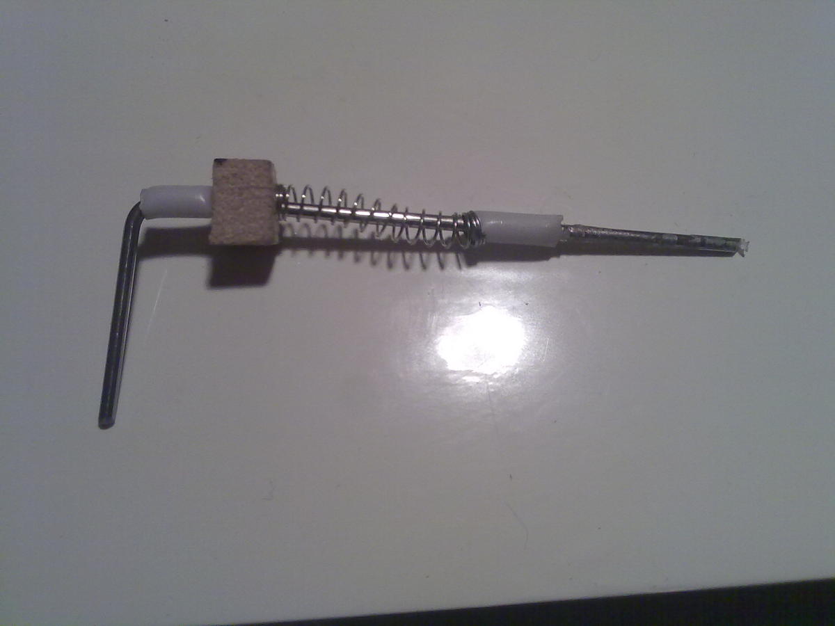 Bilde 1: Det er selve låsen, der ser du pianotråden, plasthylsa, treklossen og fjøra.