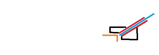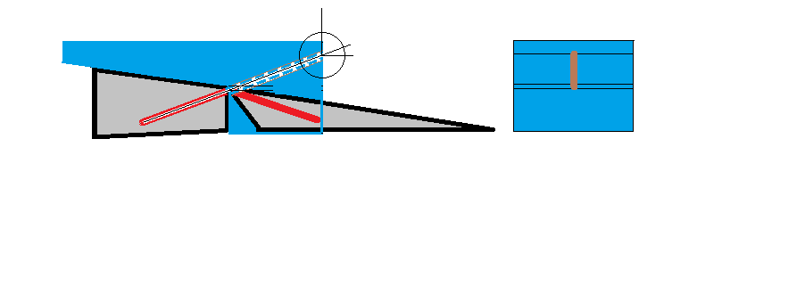 Finn eller lag en trebit som er formet som det svarte på tegningen. Denne vil du kunne sette enkelt på bakkanten av vingen eller forkanten av roret, vinge/ror illustreres av den orange vinkelen. Du borrer et hull der det røde "røret" er, i dette hullet borrer du inn i vinge eller ror, blå strek illustrerer borr. Prøv deg frem med å lage noen jigger før du borrer i vingen slik at du er førnøyd med vinkelen. Setter du inn et mesingrør i trevinkelen blir det enda enklere å borre da borret støttes godt inni messingen