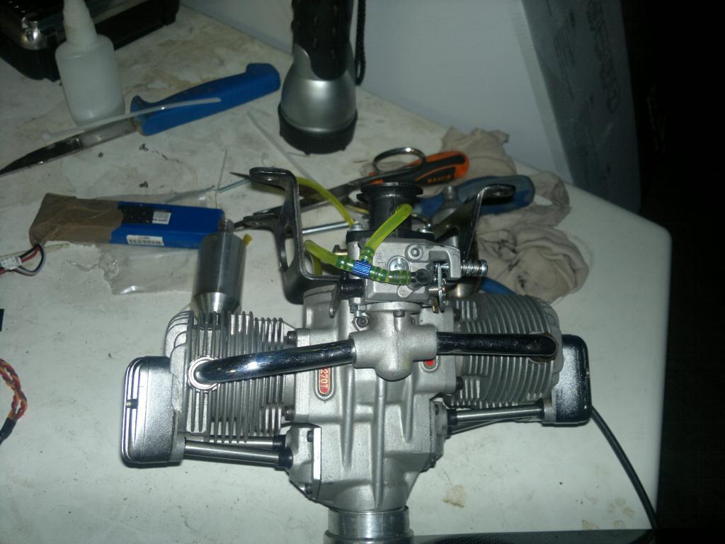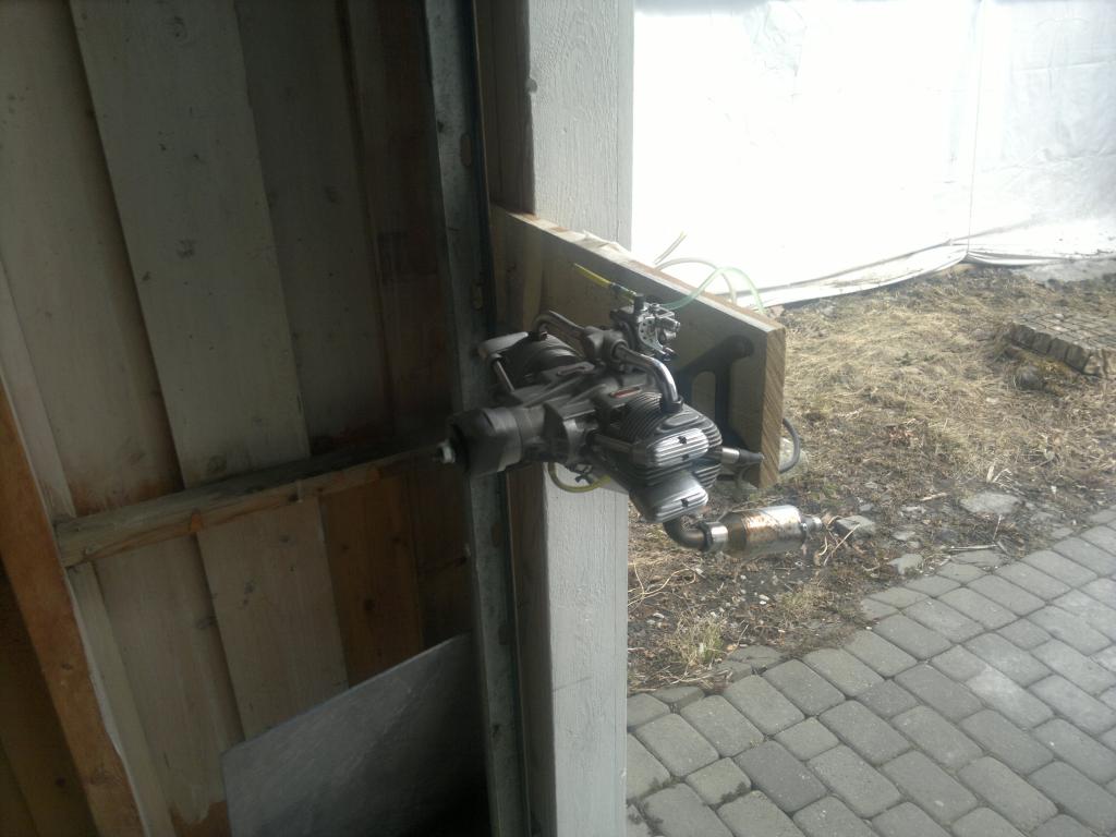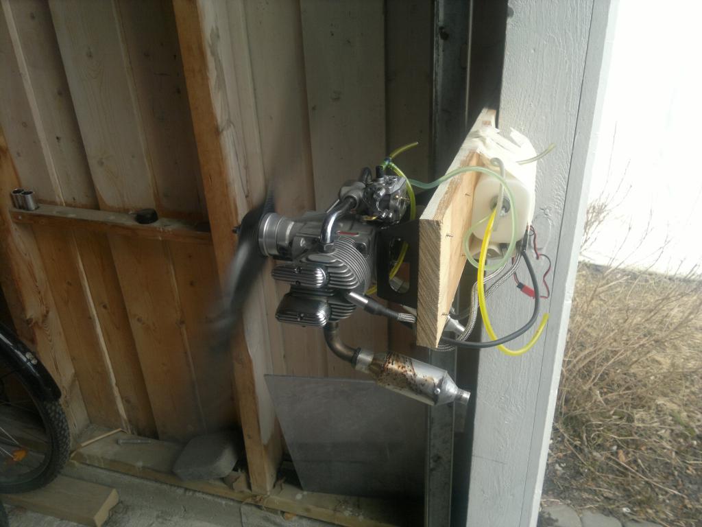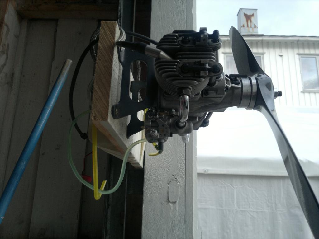 Hadde liggende en Saito 270 som jeg fant ut jeg skulle konvertere til bensin. Det første jeg måtte gjøre var og skifte alle lagrene i motoren, ikke for at den skulle konverteres men fordi de var dålige. Montere på elektronisk tenning og en forgasser fra en eller annen liten bensinmotor jeg hadde liggende. Skrude opp motoren på en borfjøl i etermidag å satte på en 20x8 propell. Noen få flipp og den startet på 95 oktan med 3% syntetisk 2t olje. Lit finjustering på forgasseren og den gikk som en drøm. Drar utrolig bra og akselrerer fra tomgang som et skudd. Turtelleren min var selvsaft fri for batteri så jeg fikk ikke målt verken tomgang eller topturtall men det får jeg ta i morgen. Eneste lille problem er at jeg ikke får turtallet langt nokk ned får ta en titt på forgasseren og se hvorfor den ikke stenger mer.