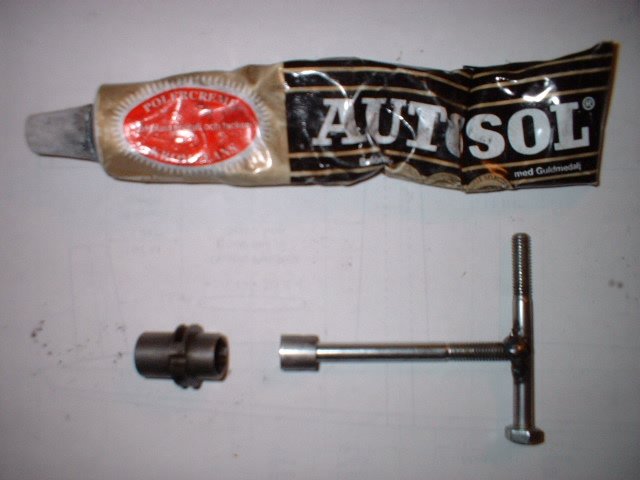 4. Bruk en håndverktøy som jeg viser til fotoet av en T-formet verktøy med hull for stempelbolt. Monter stempel med bolt til verktøyet. Smør Autosol krompoleringspasta i sylinderen og på stempelet. Før stempelet i sylinderen og poler innover mens du roterer stempelet. Hvis det stopper inne i sylinderen, dunk stempelet ut av sylinderen og vask begge deler i parafin eller bensin. Kontroller om stempelet kan føres inn i sylinderen inntil øvre dødpunkt. Hvis ikke, poler vidrer og prøv på nytt.