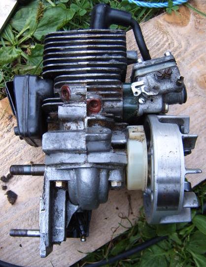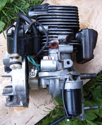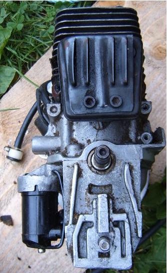 Har nå fått tak i en bensin motor. dvs jeg har plukket fra hverandre en liten motorsag som jeg synes virket egnet. den har bla. forgasser forran og utblås bak så blir den ikke så bred som for eks zenoah motorene. aner ikke hvor stor den er men vil tippe rundt 25-30ccm. målte etter i 1/6 storchen jeg driver å bygger og den fikk fint plass i snuta der med sylinderen ned