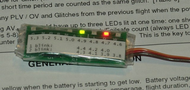 På bildet har jeg selv tapet på en lapp med de spenninger jeg har innstilt VoltMagic på. Plugget i et nesten utladet batteri, og roterte stikkene en stund. Spenningen krøp ned til 4,6V eller lavere. Den grønne lampa viser aktuelt spenningsnivået på 4,9V, etter å ha ligget i ro en stund. Under belastning var laveste spenning helt nede i 4,0V, noe som vises ved at den røde lampa blinker med ett blink av gangen. Hadde samme lampe gitt 2 blink hadde det vært 3,9V.