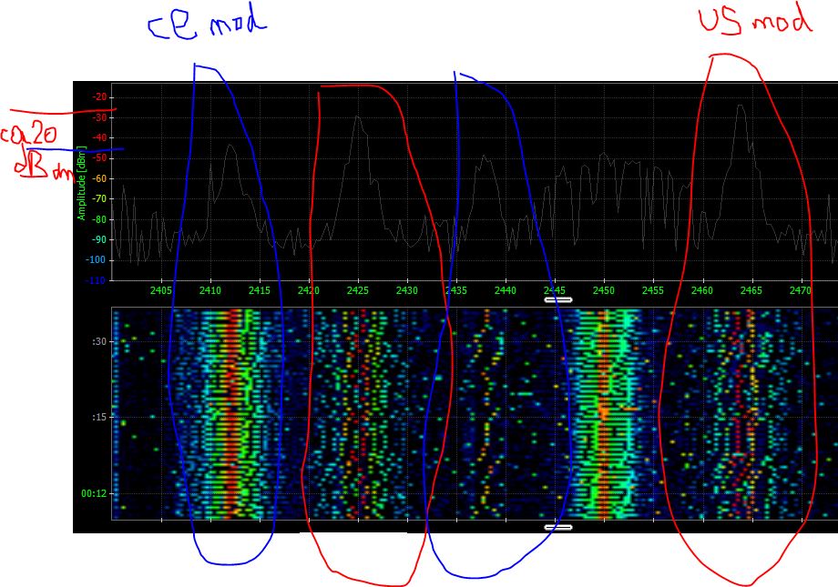 Jeg har hørt (understreker hørt da jeg ikke har giddet og grave i det selv) at det som skiller lovlig sendereffekt (og CE merket) ikke er frekvenshopping som "alle" sier, men derimot frekvensskanning slik som Spektrum gjør før den velger 2 ledige kanaler. Dette for og ikke sende ut blindt med høy effekt på frekvenser som er optatt som strengt tatt er det som teller for og ikke forstyrre andre.