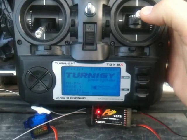 Det virker som at det er en forsinkelse fra jeg flytter stikka på radioen til servoen reagerer. I tillegg flytter servoen seg bare bitvis. Det virker altså som at det er forbindelse mellom Rx og Tx, men det er jo umulig å fly med.
