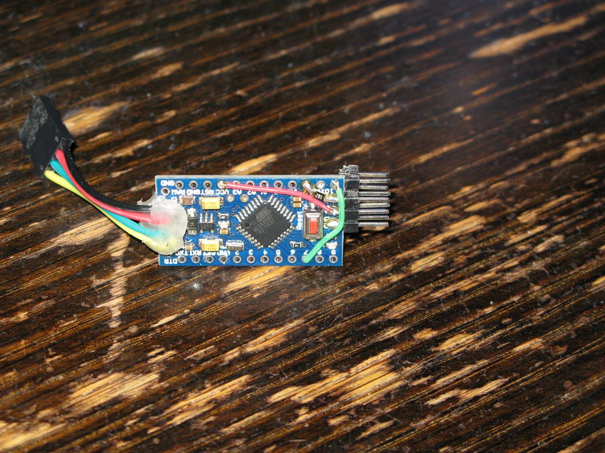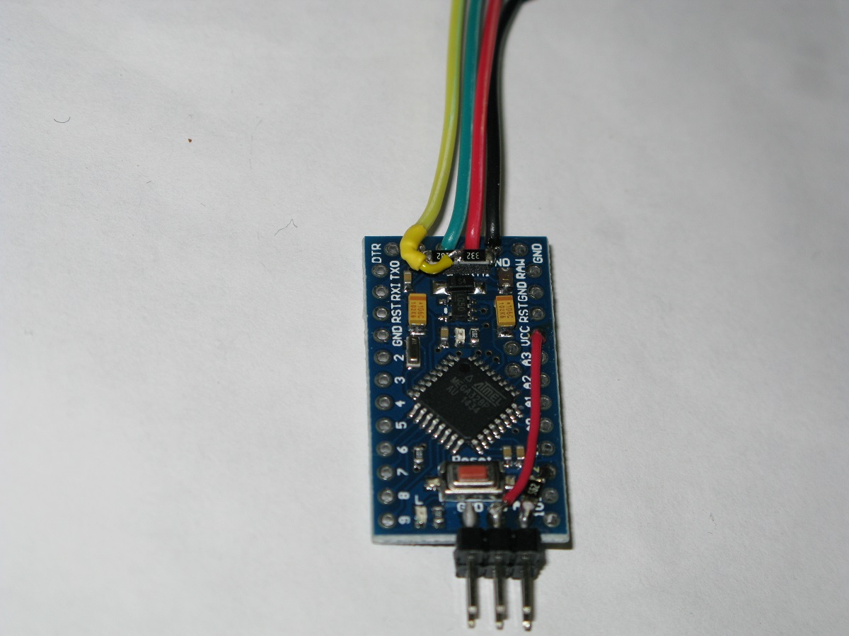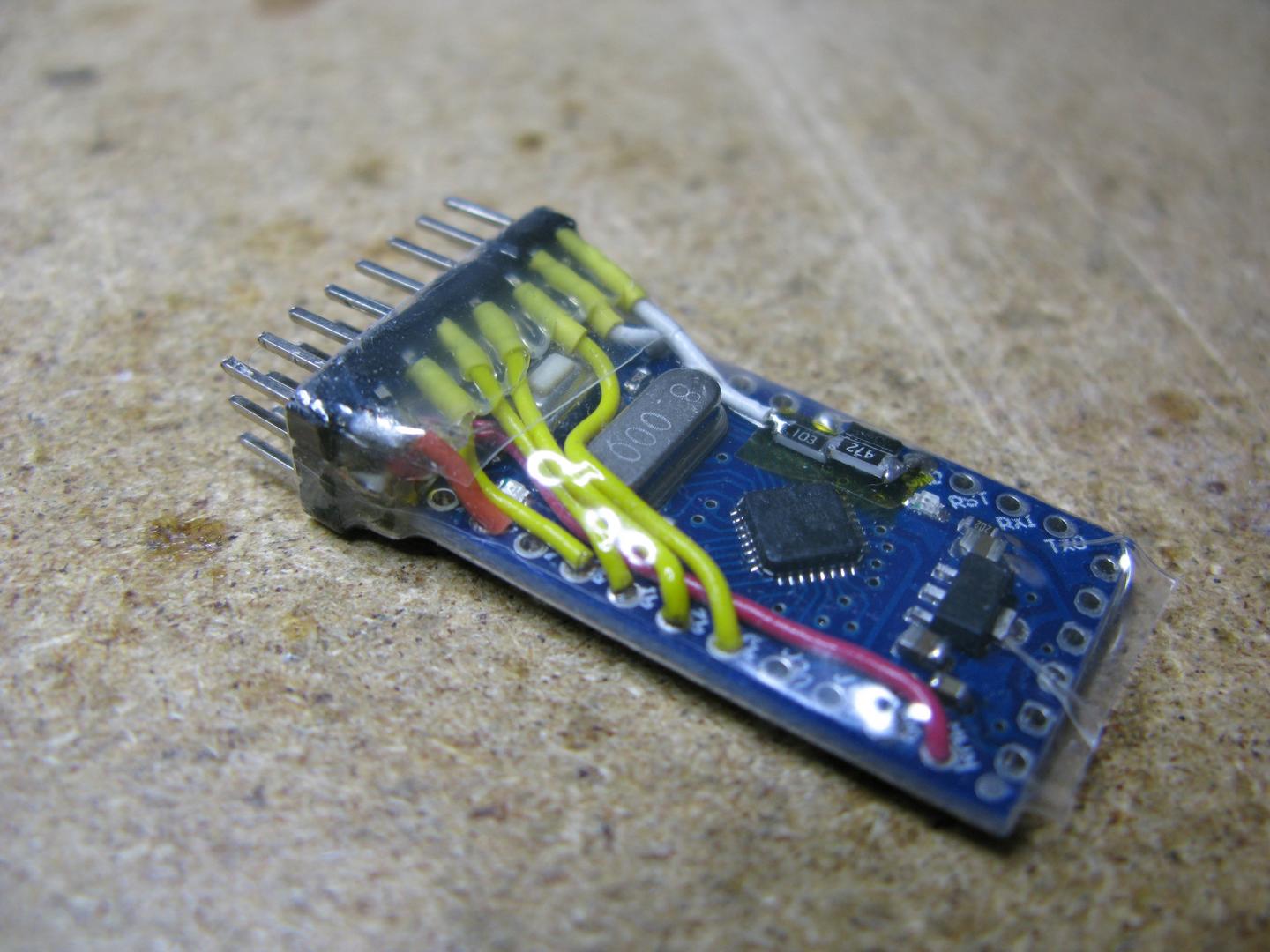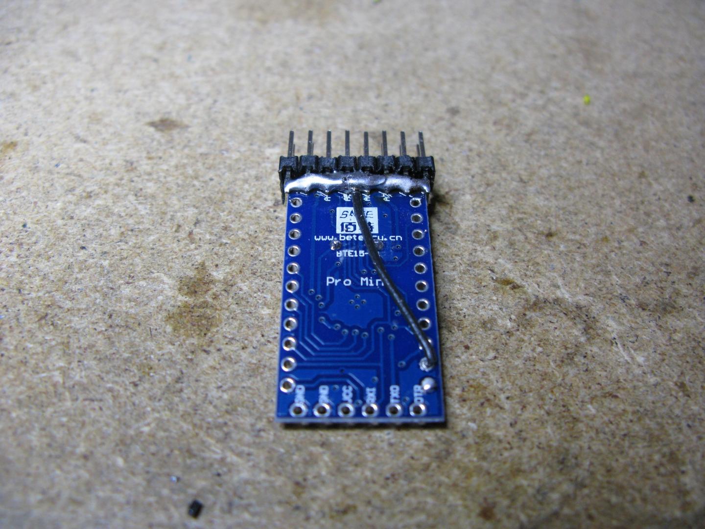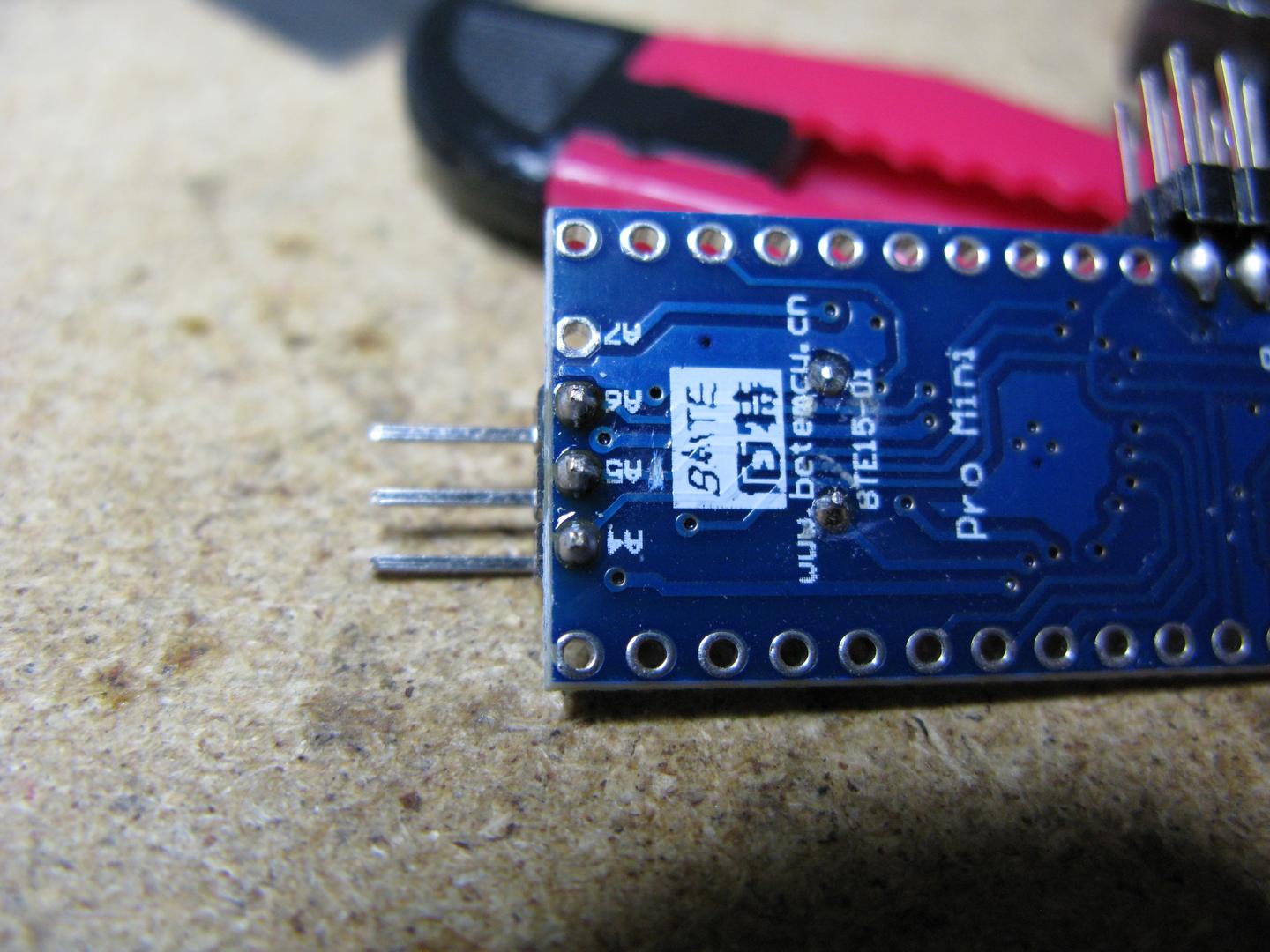 Alle er basert på Arduino Pro Mini 16 MHz/5V. Jeg valgte en variant som har Gnd, A6 og A7 i den ene enden. Her loddet jeg pinnene for diverse tilkoblinger. I den endelige versjonen ble det en 3-pins og to 4-pins rekker. A6 tjener som 5V, så jeg loddet en ledning mellom 5V punktet og A6. A7 brukes som signal. Siden mottagerene helst skal ha 3.3V på telemetriinngangen, loddet jeg en 5,6k motstand mellom A7 og D12, som er pinnen hvor signalet egentlig genereres.