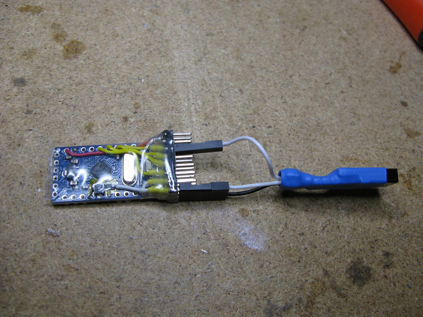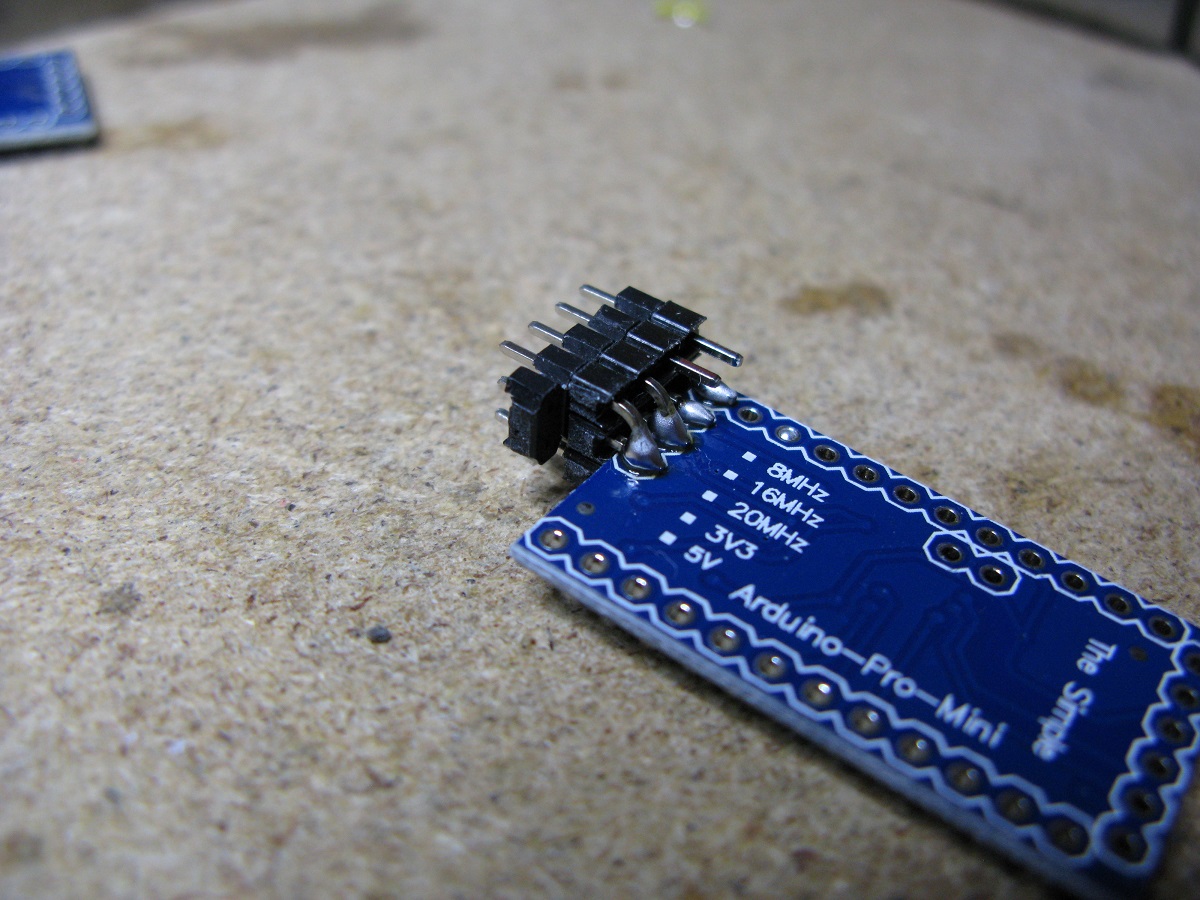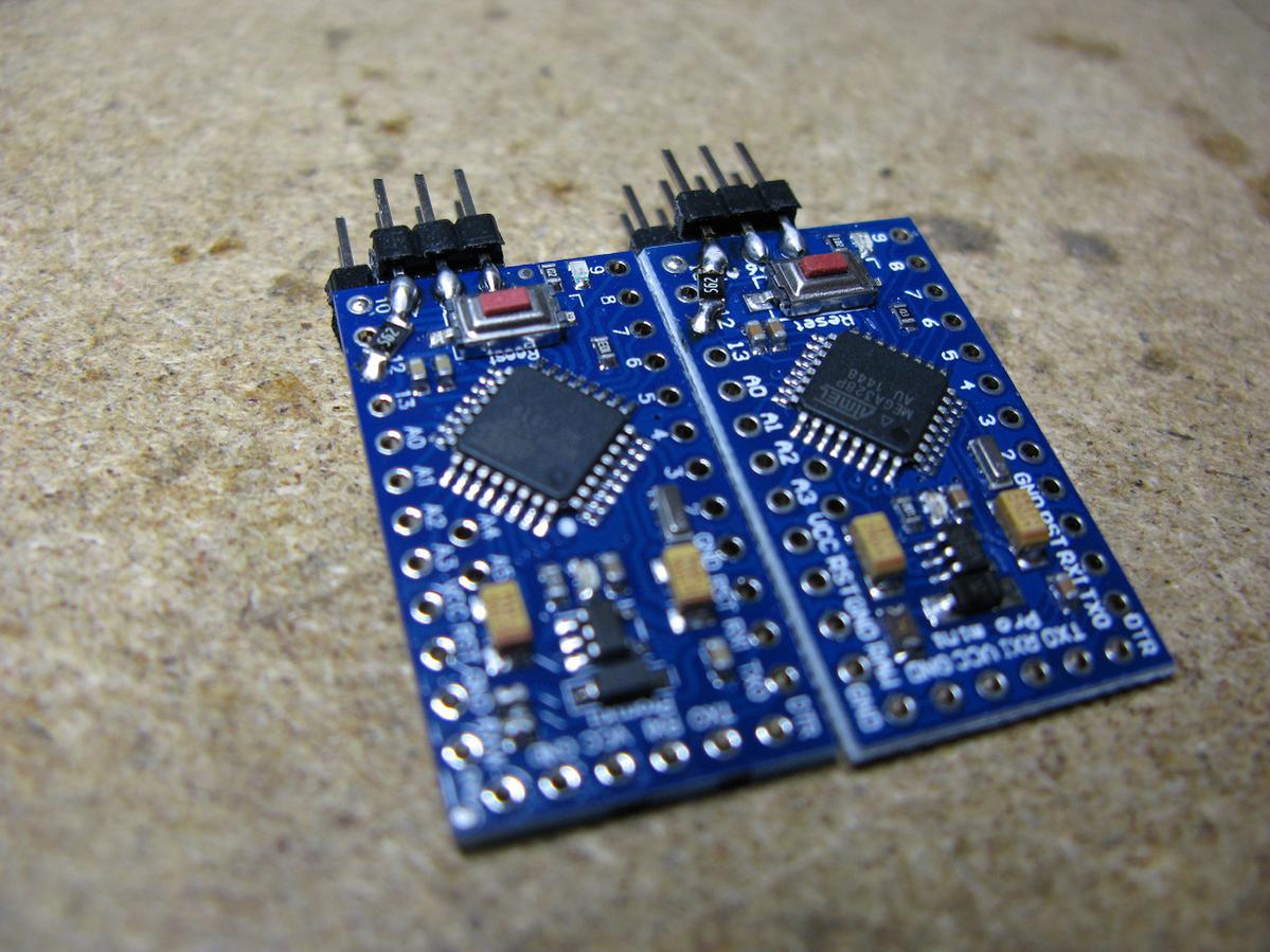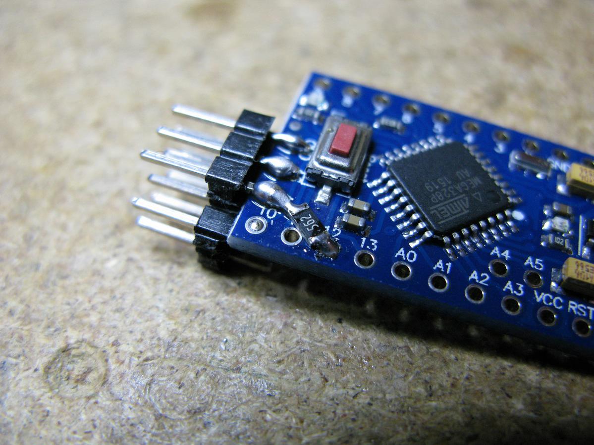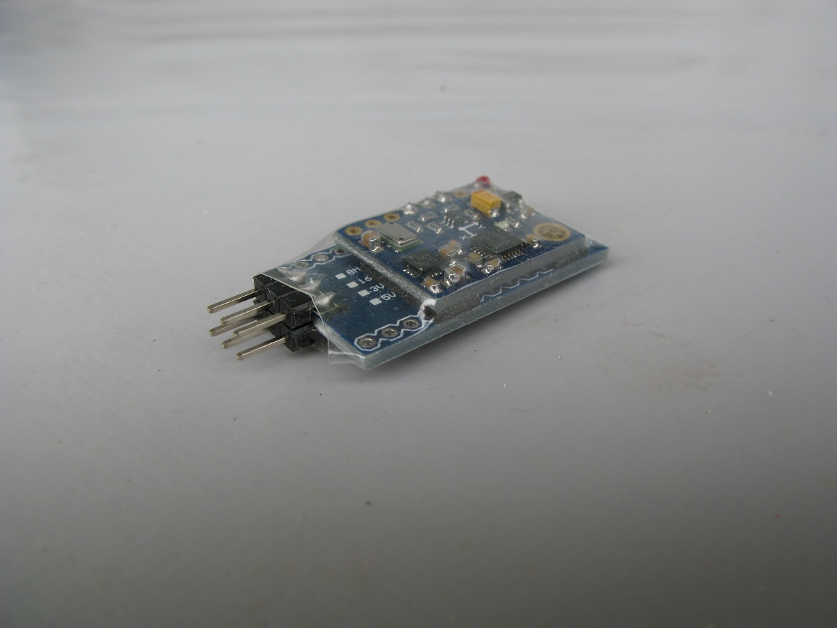 Alle er basert på Arduino Pro Mini 16 MHz/5V. Jeg valgte en variant som har Gnd, A6 og A7 i den ene enden. Her loddet jeg pinnene for diverse tilkoblinger. I den endelige versjonen ble det en 3-pins og to 4-pins rekker. A6 tjener som 5V, så jeg loddet en ledning mellom 5V punktet og A6. A7 brukes som signal. Siden mottagerene helst skal ha 3.3V på telemetriinngangen, loddet jeg en 5,6k motstand mellom A7 og D12, som er pinnen hvor signalet egentlig genereres.