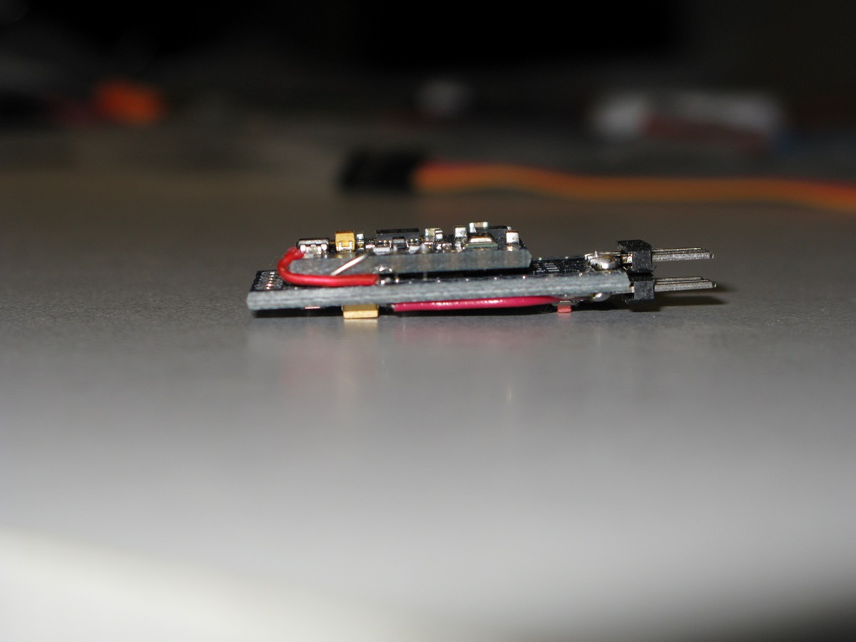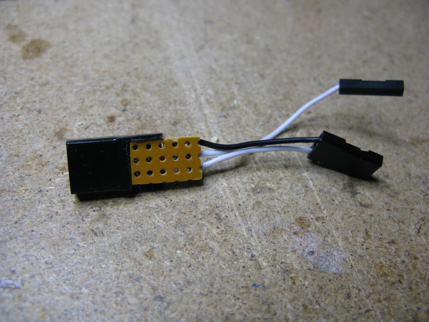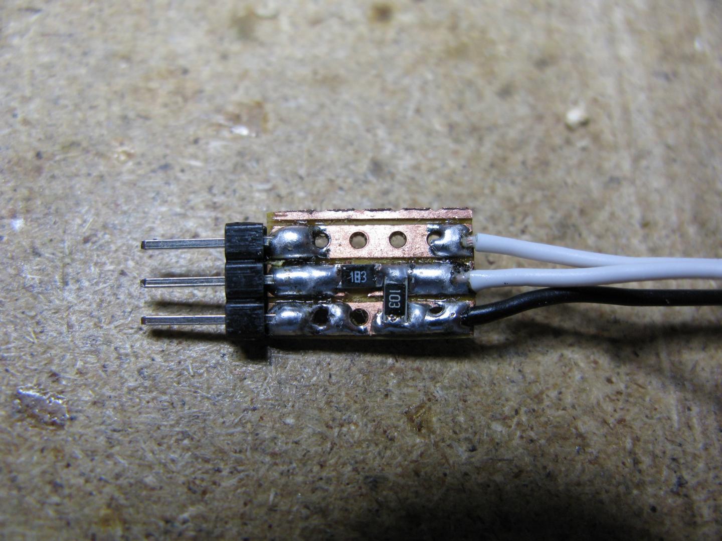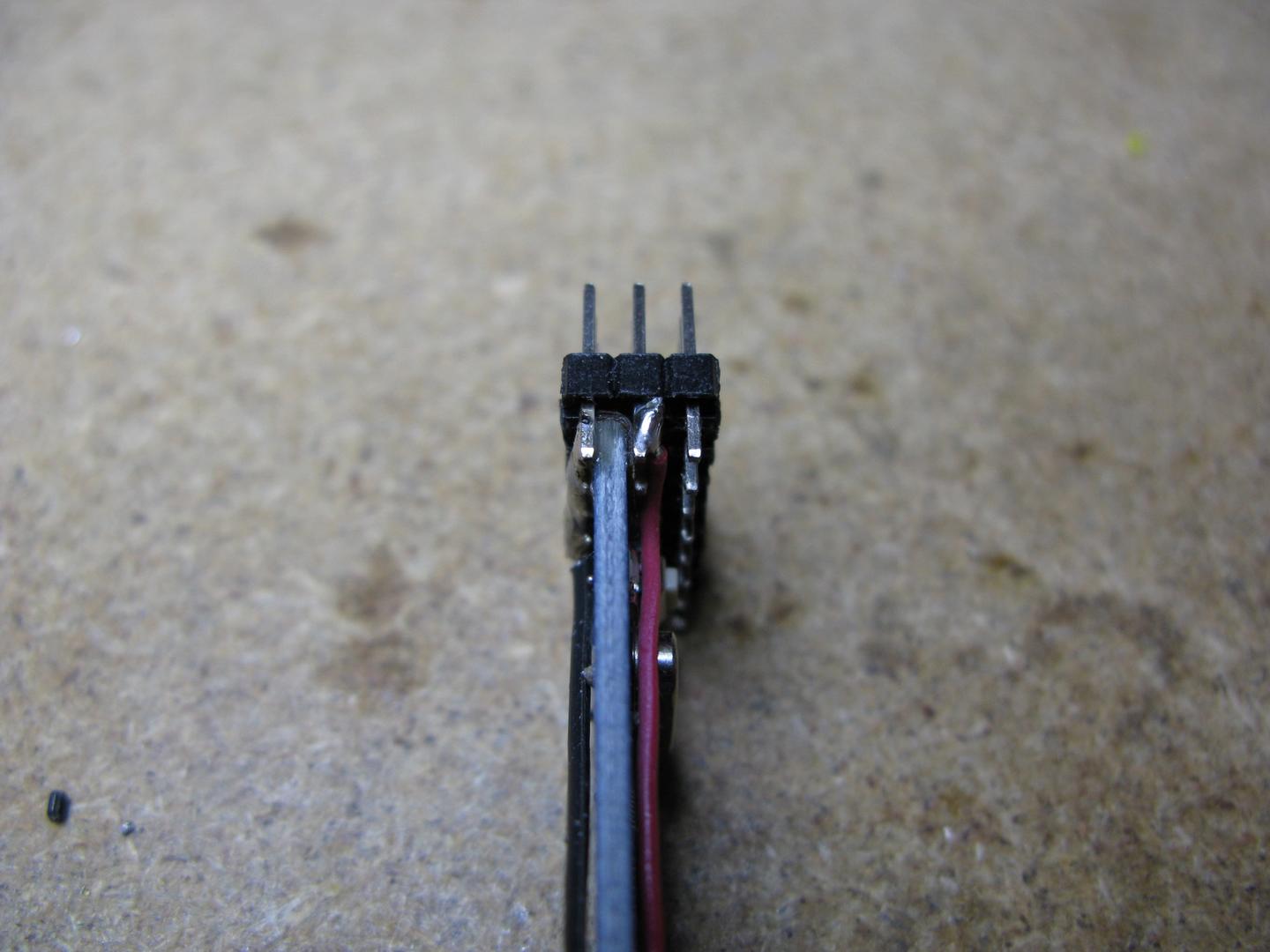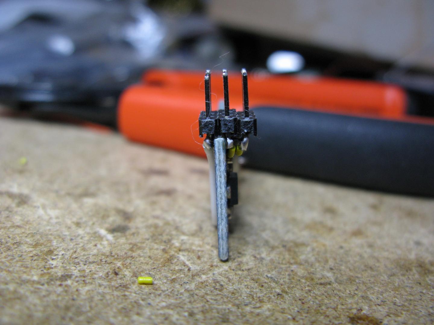 De tre første pinnene i rad to er bare koblet parallelt med de tre første for å kunne koble sammen flere SPort sensorer. Den fjerde pinnen kan brukes for å motta data fra andre "D"-sensorer, f.eks. telemetri fra en MultiWii kontroller. Denne er fysisk loddet til D10, mens signalet egentlig skal inn på D7. Derfor lodder jeg en ledning mellom D7 og D10.
