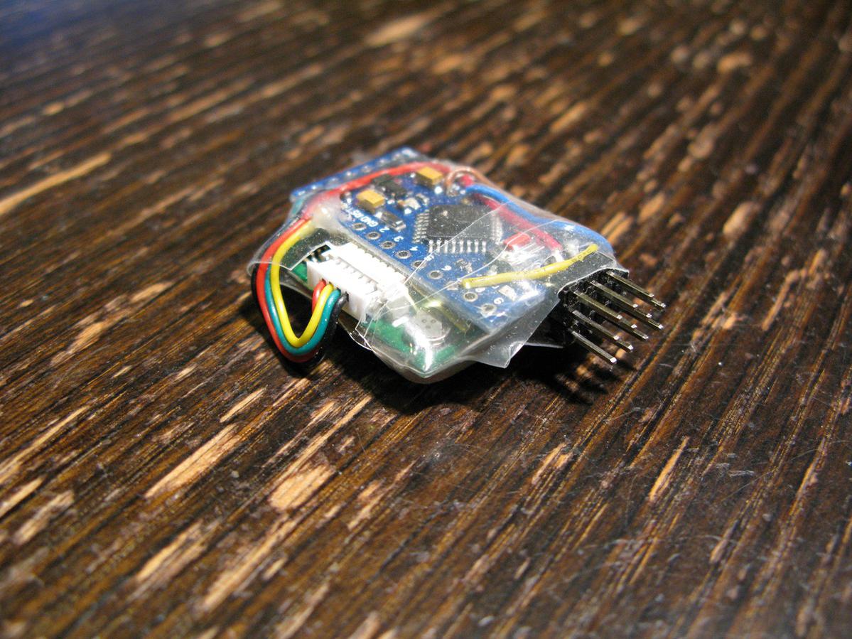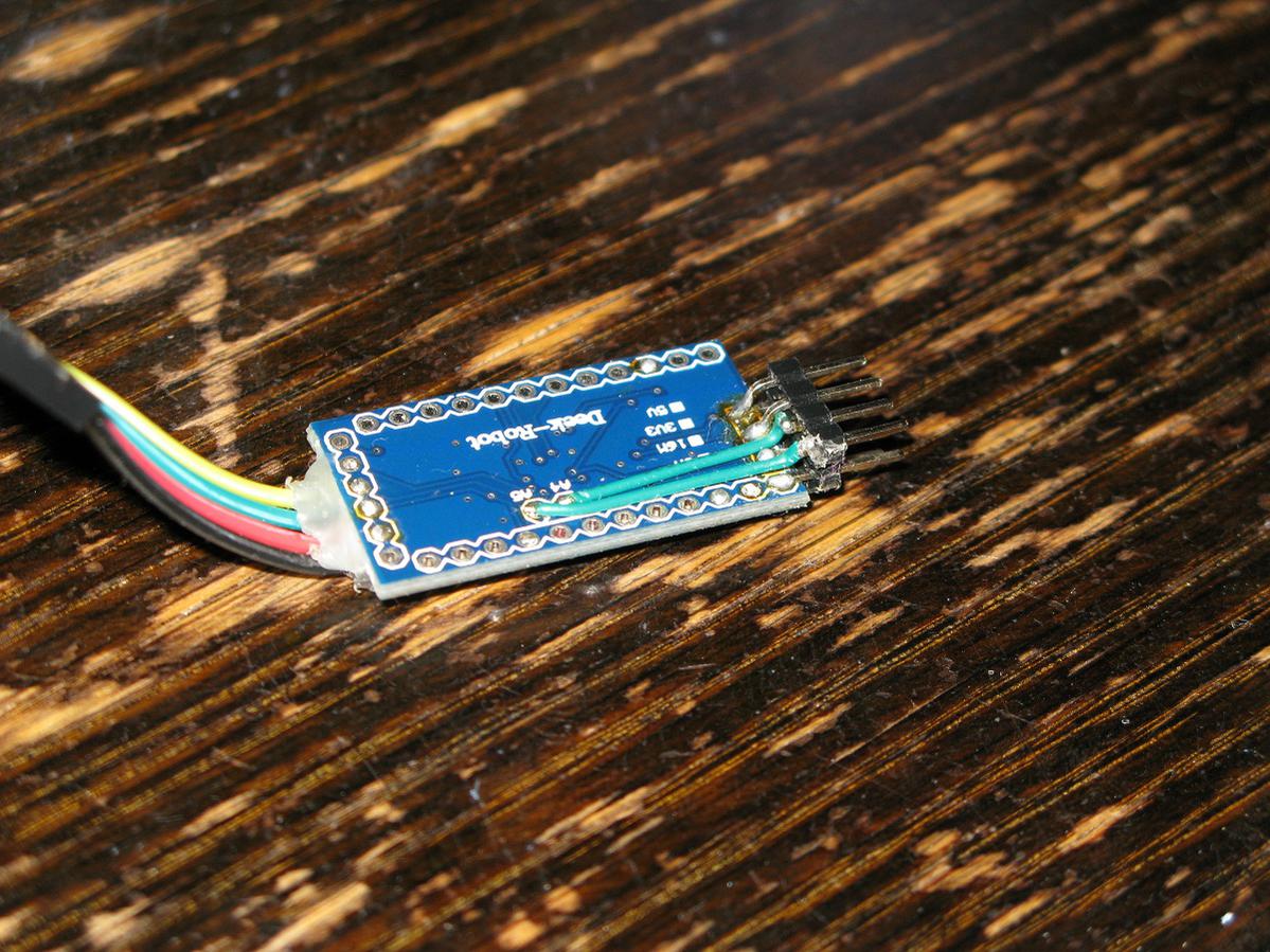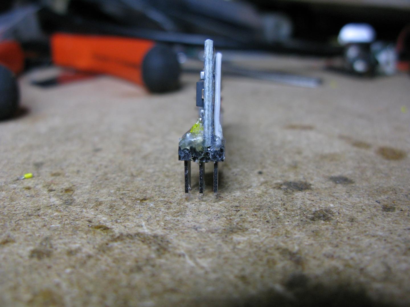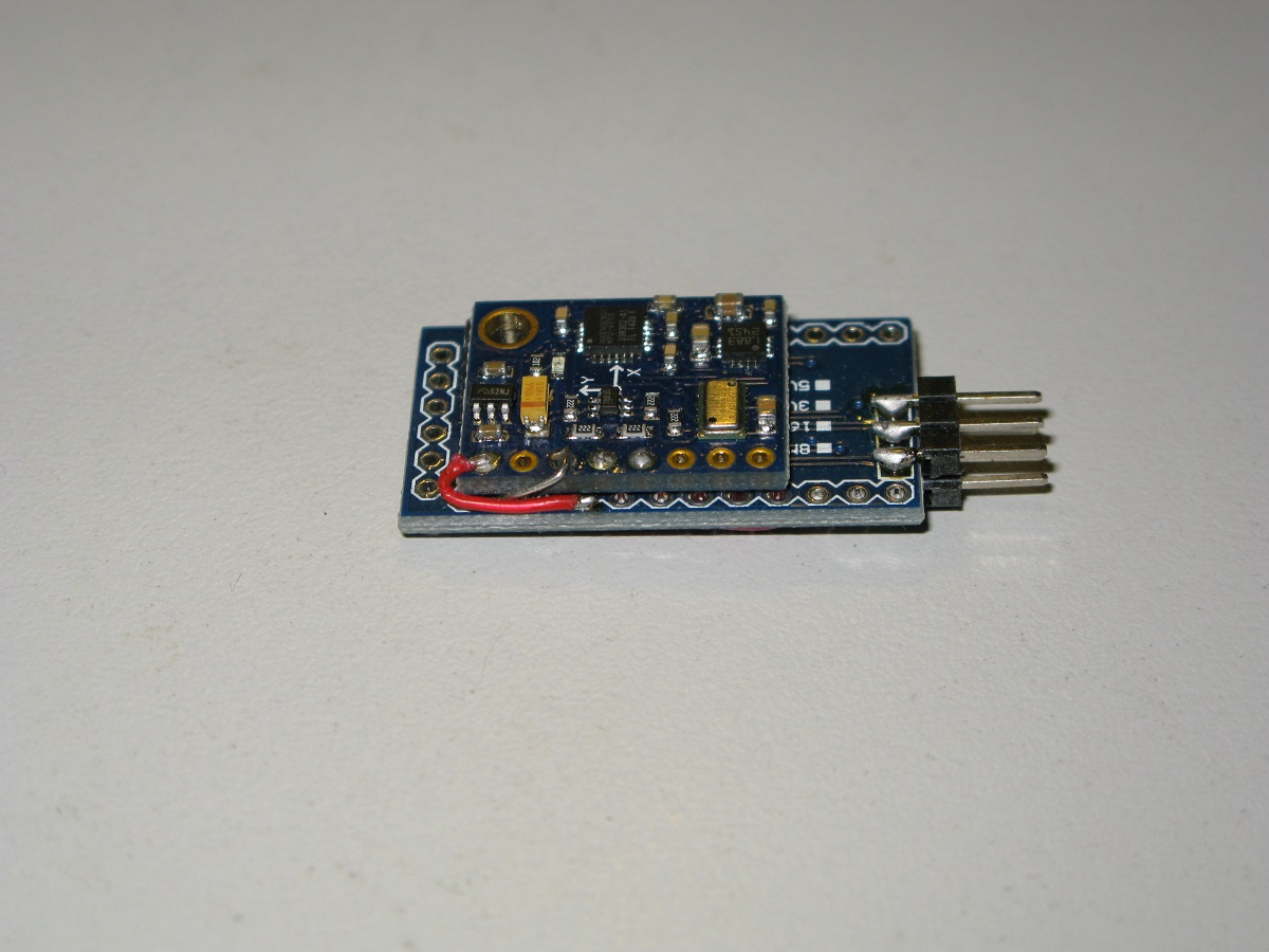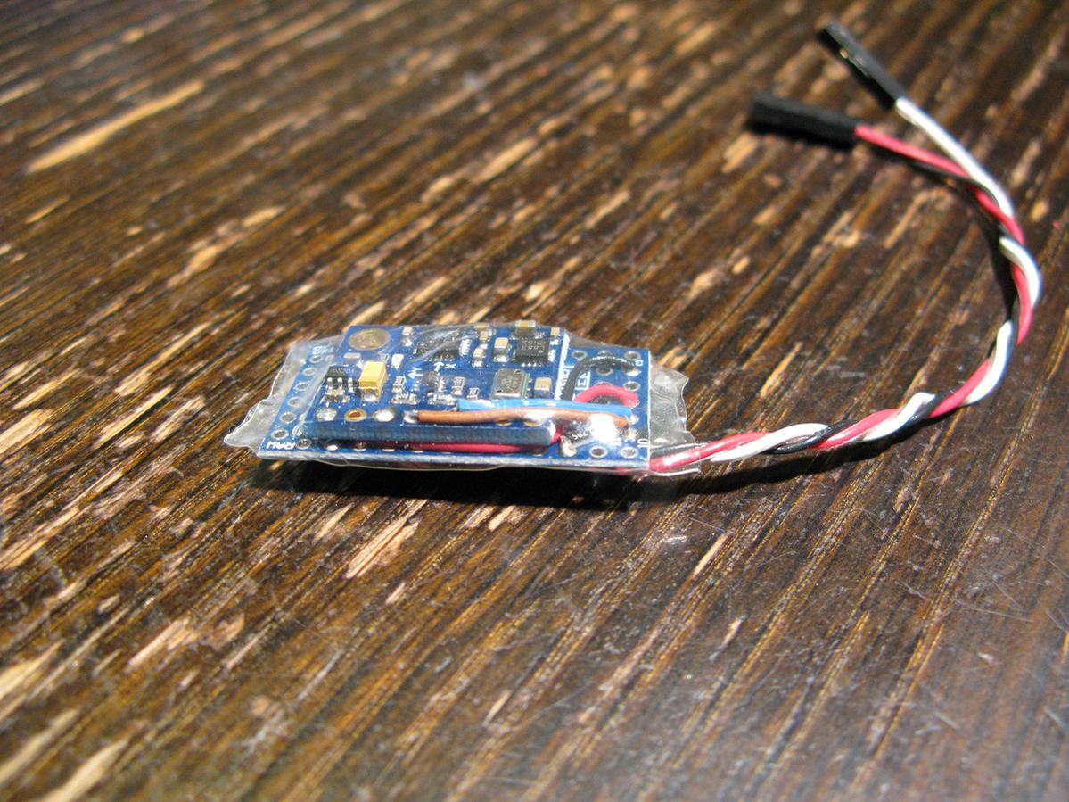 De tre første pinnene i rad to er bare koblet parallelt med de tre første for å kunne koble sammen flere SPort sensorer. Den fjerde pinnen kan brukes for å motta data fra andre "D"-sensorer, f.eks. telemetri fra en MultiWii kontroller. Denne er fysisk loddet til D10, mens signalet egentlig skal inn på D7. Derfor lodder jeg en ledning mellom D7 og D10.