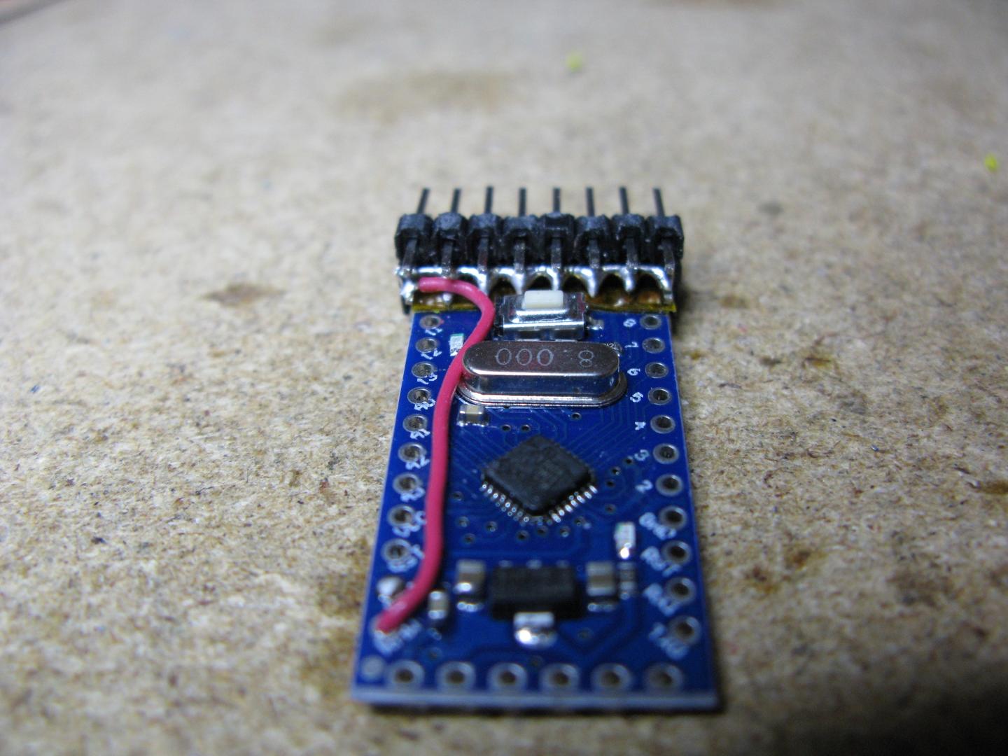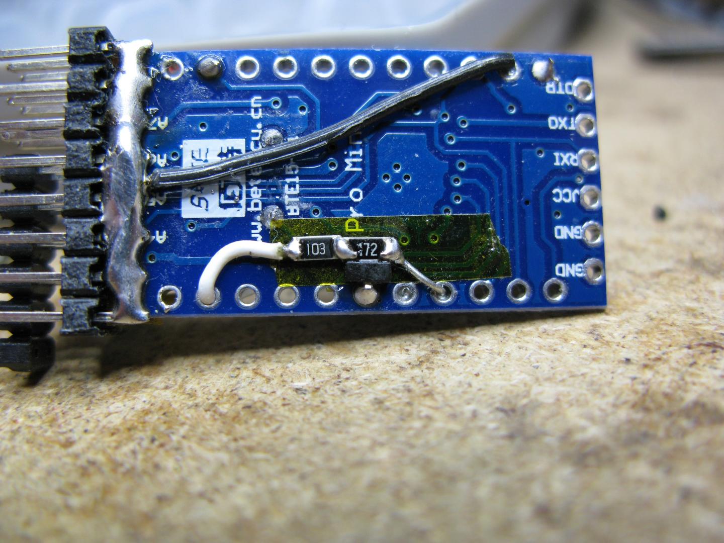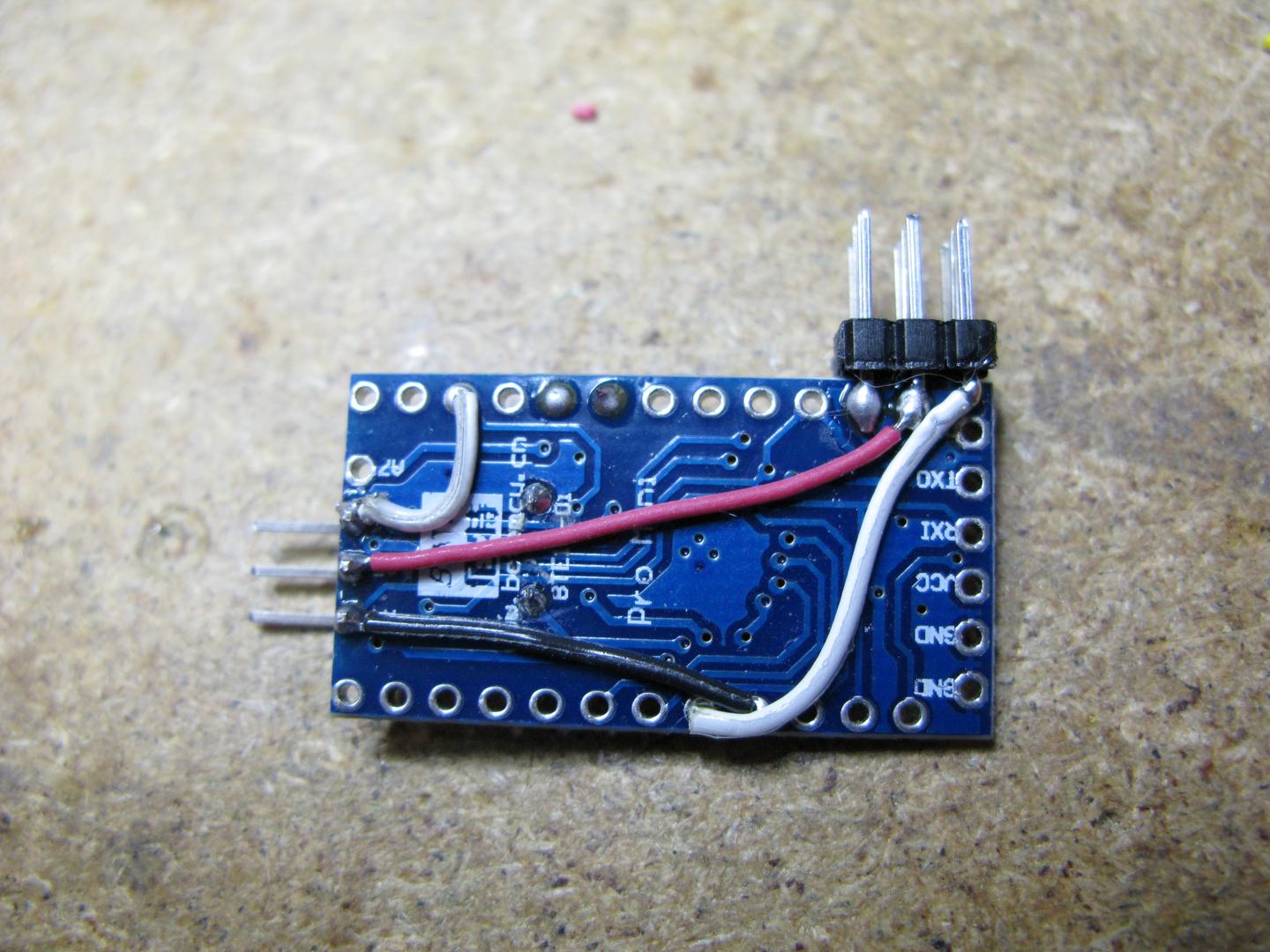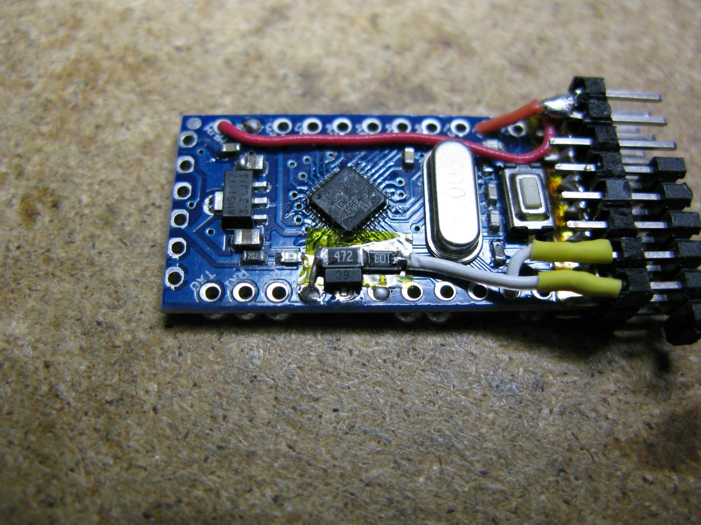 Ledning fra Vcc til A6 (+5V), SMD motstand mellom D12 og A7 (signal) og ledning fra A7 til A10 (hvis "D"-data input skal brukes).