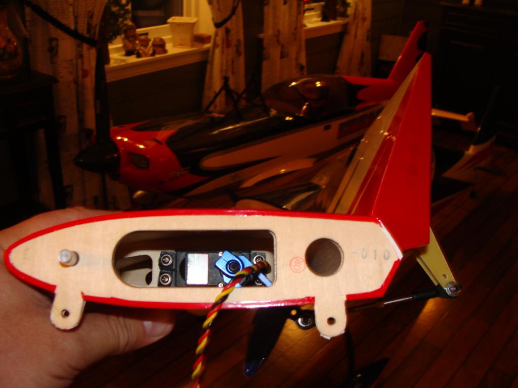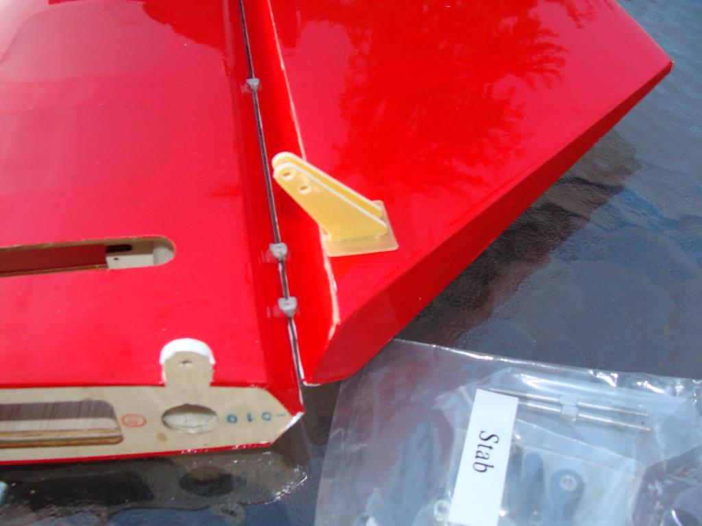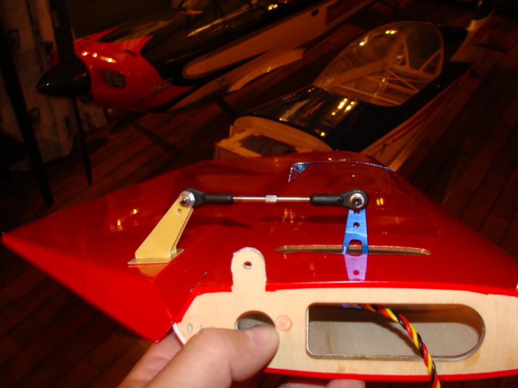 2. When using a single rudder servo in the tail of the fuselage, mount the pushrod on the underside of the servo arm so it will clear the elevator. I have found it easier to install the pushrod and ball link onto the servo arm before installing the arm onto the servo output spline. I have included a picture of this linkage.