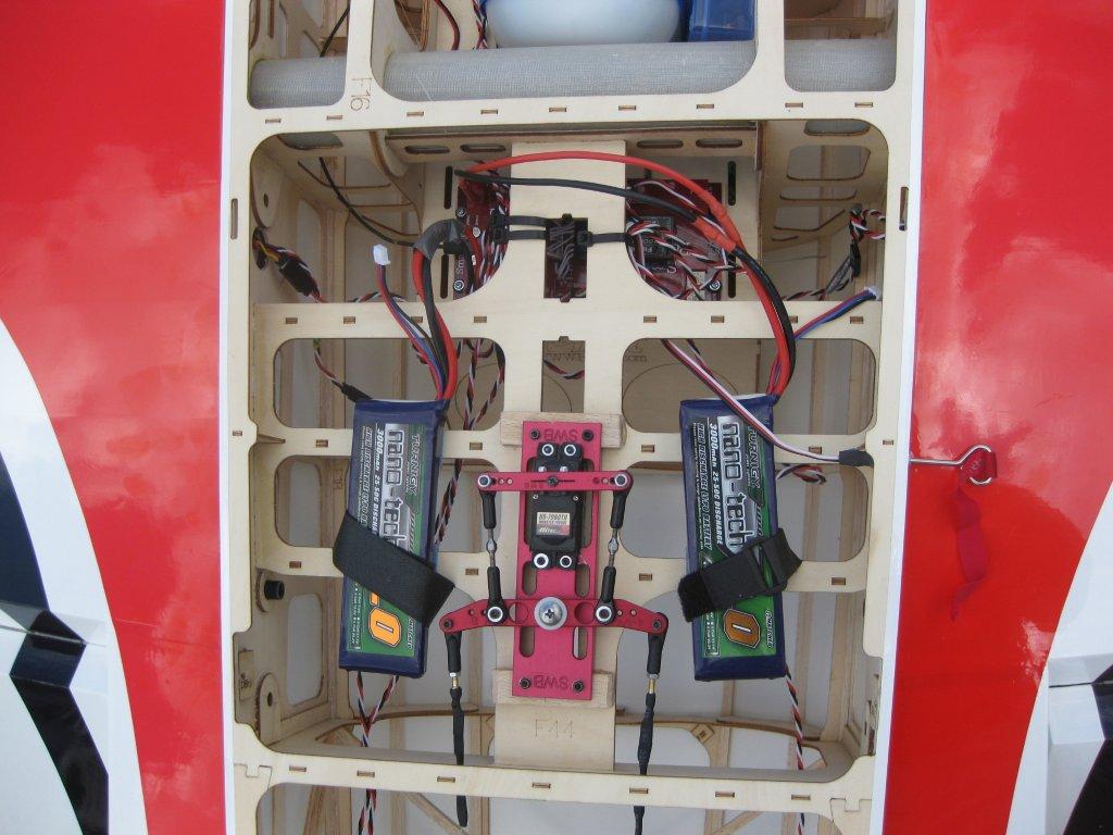 Tok ut servoene som sto i, 3 pr. vinge, 2 pr. stab og 3 på sideror. Satte i 2 pr. vinge, 1 pr. stab og 1 på sideror. Fikk letta flyet litt altså