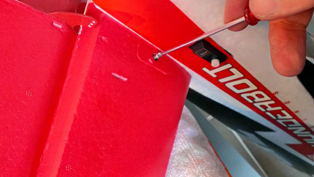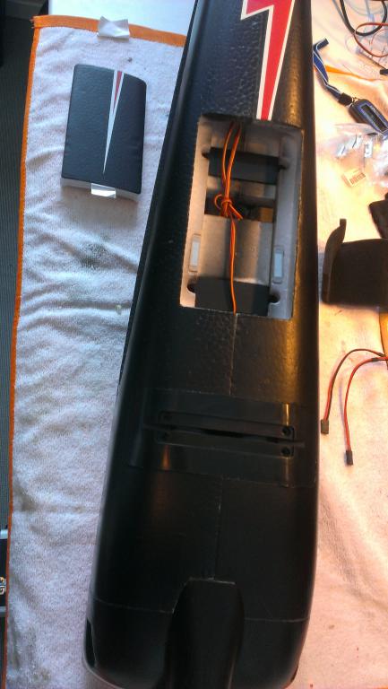 Nå som sideroret er lim på går vi videre til å montere høyderoret.. Igjen en enkel sak som består i å tre i den ene halvdelen og så tre i den andre, ikke glem glassfiberstanga. Høyderoret festes så med to skruer på undersiden.