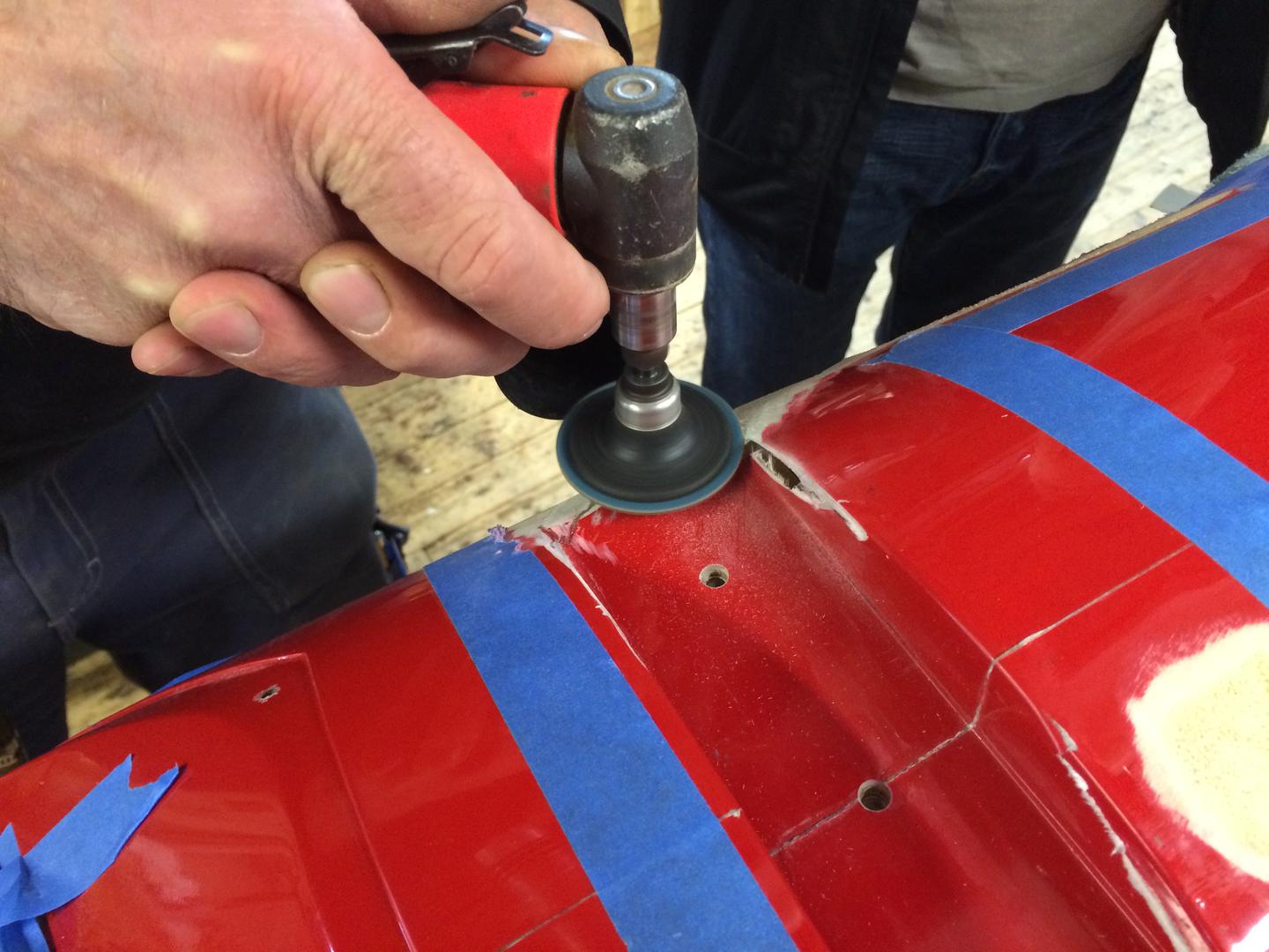 Det må brukes et veldig fint slipepapir da skroget er (overaskende) tynt. Sliper ned til og med det skummet som ligger som et lag mellom epoxy'n. Ikke mye materiale å jobbe med her, så det er viktig å prøve og beholde så mye av skroget som mulig slik at man får bygget opp igjen i rett form.