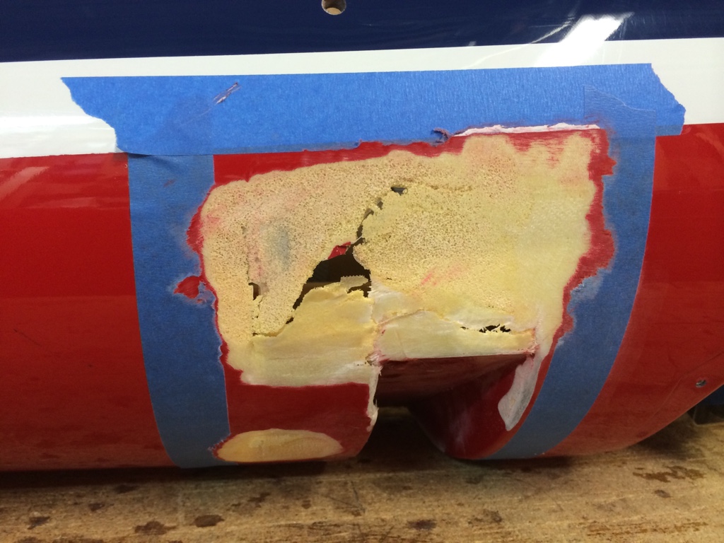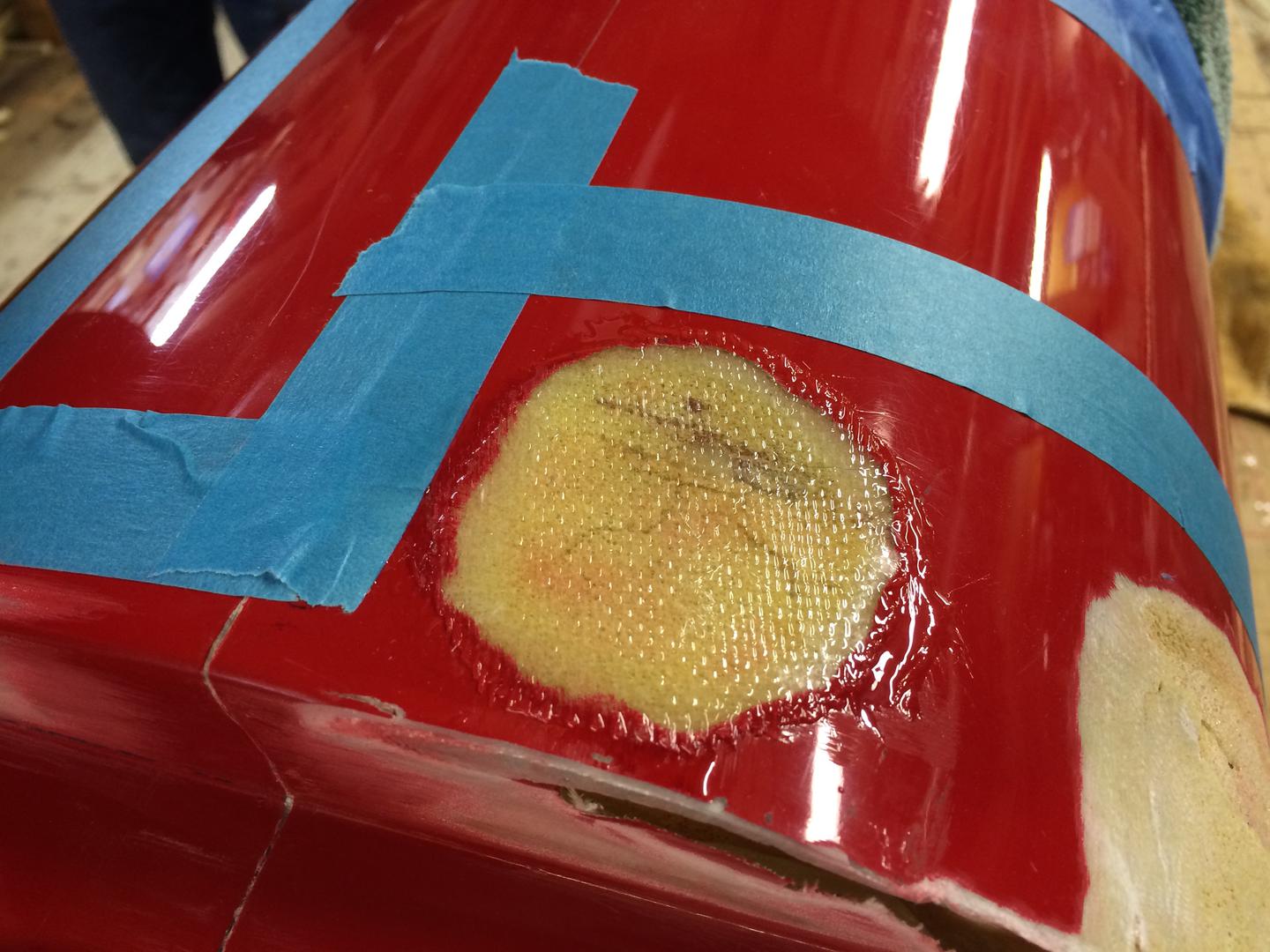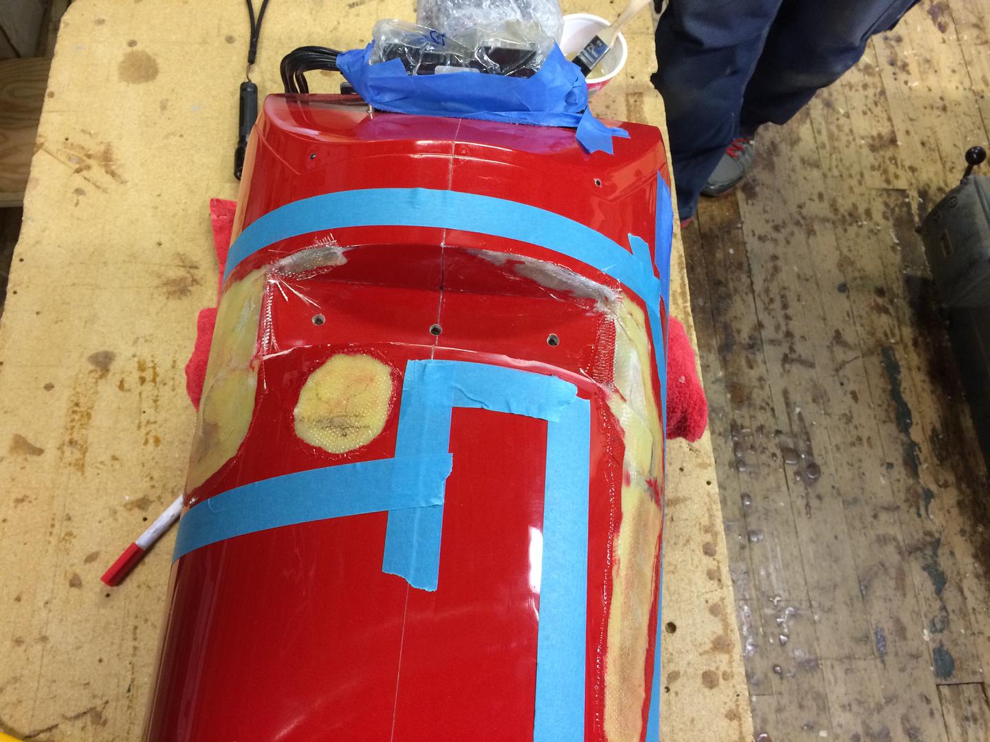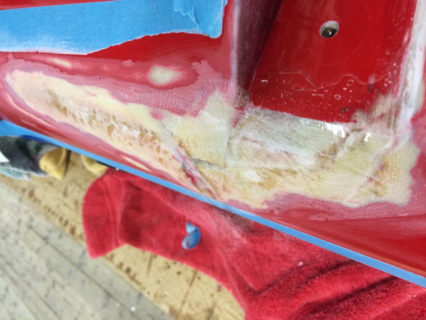I forkant hadde jeg slipt ned på utsiden rundt de skadete områdene, slik at en oppstøping med carbon eller glassfiber kunne gjøres.