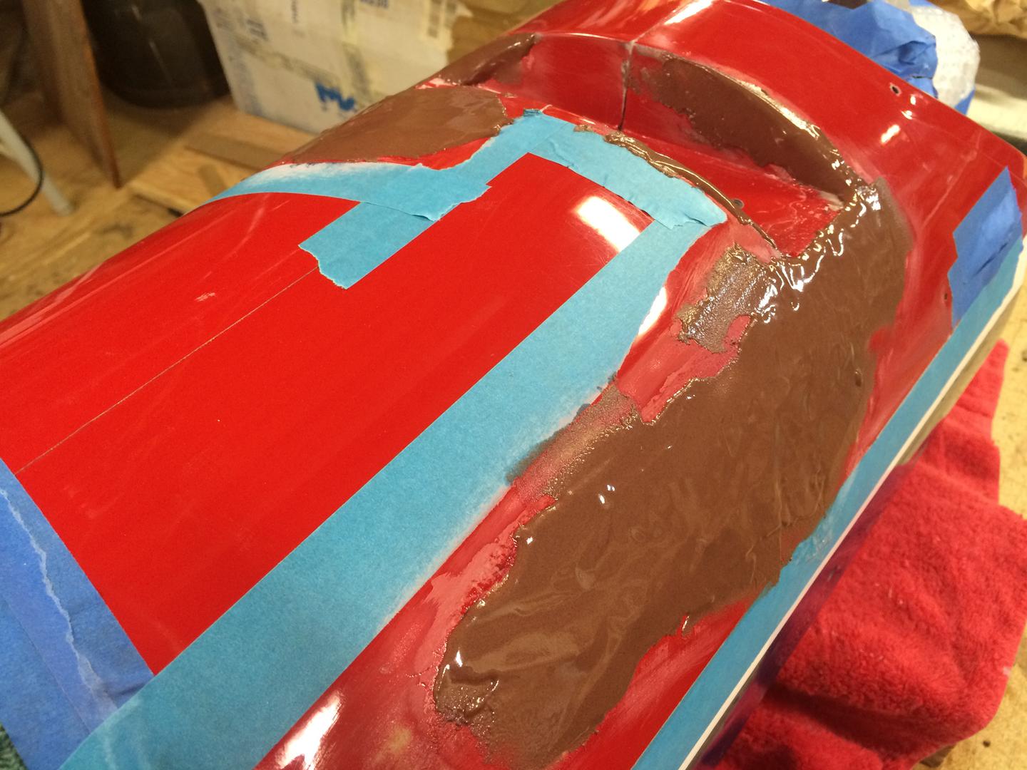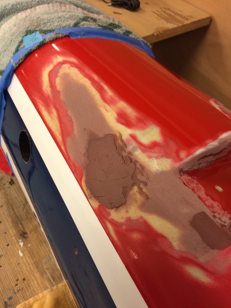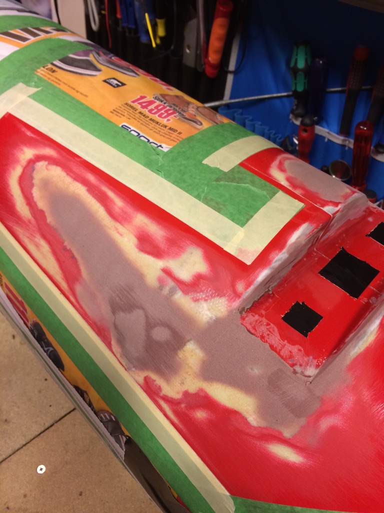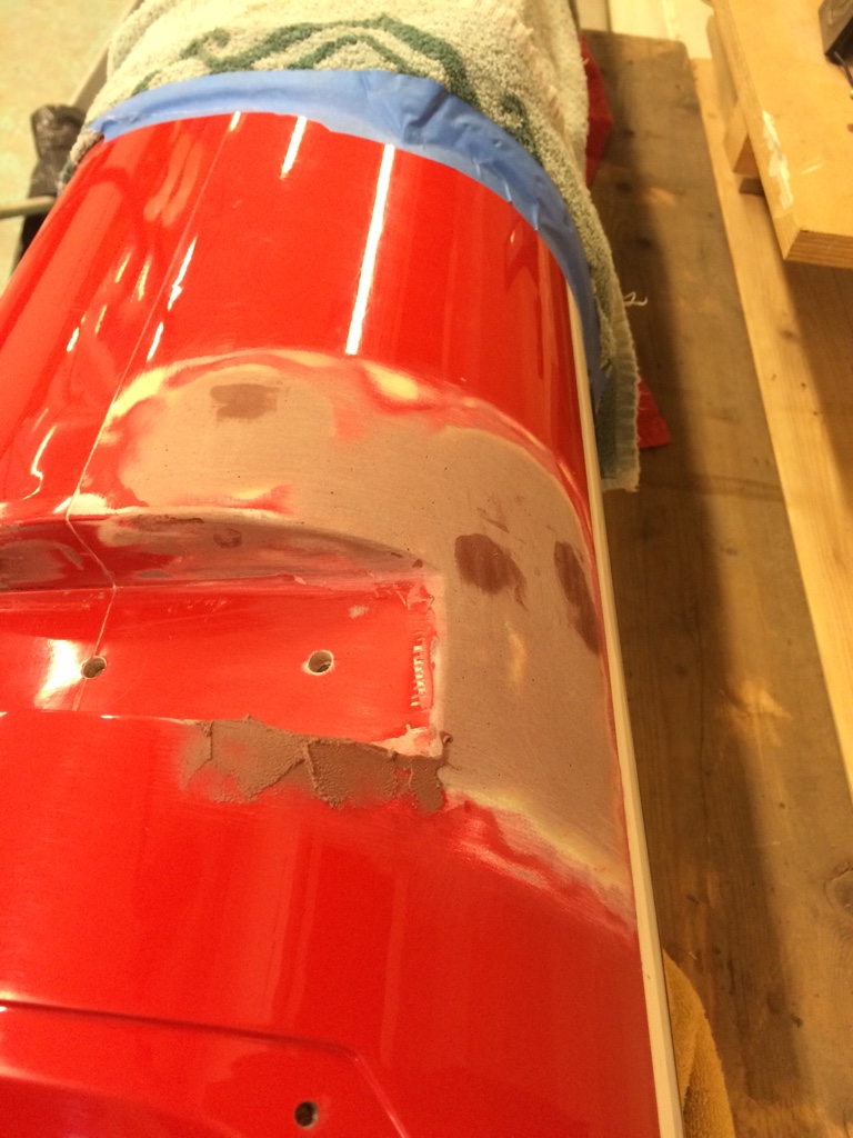 Videre arbeid i kveld. Pusse ned glassfiber som ble lagt på utsiden. Klargjøre for epoxy sparkel.