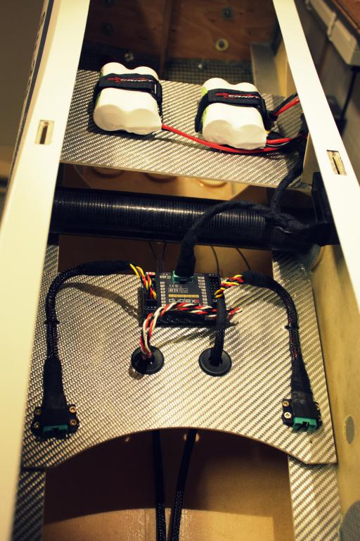 Løsningen på plassering av mottager brett og mottager batterier er på plass - ikke festet fast enda. Expander for telemetri settes fremme hvor drivbatteri brett kommer - mellom vingerør og firewall.