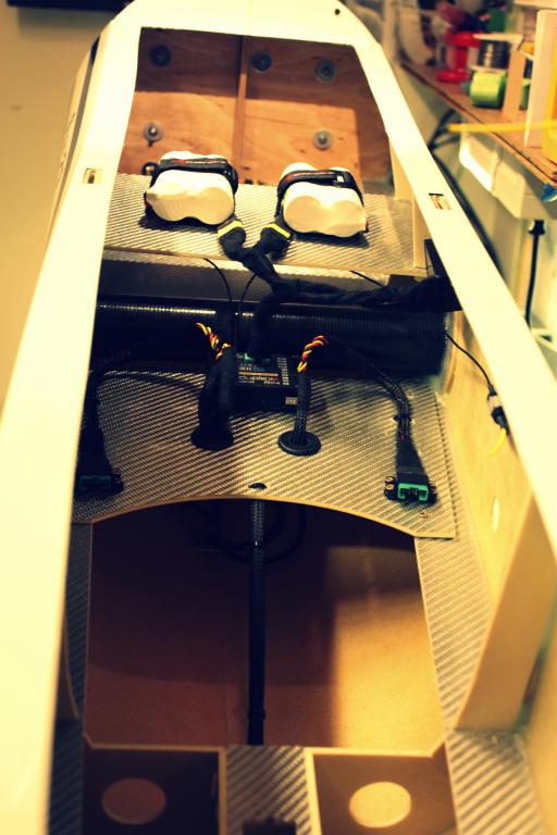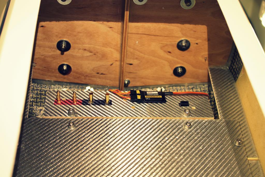 Batteribrett og tilkoblinger er klare. Feste av batterier gjøres ved justering av CG. I front sitter expanderen for telemetri, samt plugg for tilkobling av JetiBox til ESC om dette skulle være nødvendig. Dette sitter nå 2 stk MUI 200A ( en for hver av 15S pakkene ). Disse viser A (ampere ) mAh ( forbrukt størm ) og tid. RPM sensor viser naturlig nok rpm, men og W ( effekt ). I tillegg hentes det ut mottager batteri spenning rett fra mottager.