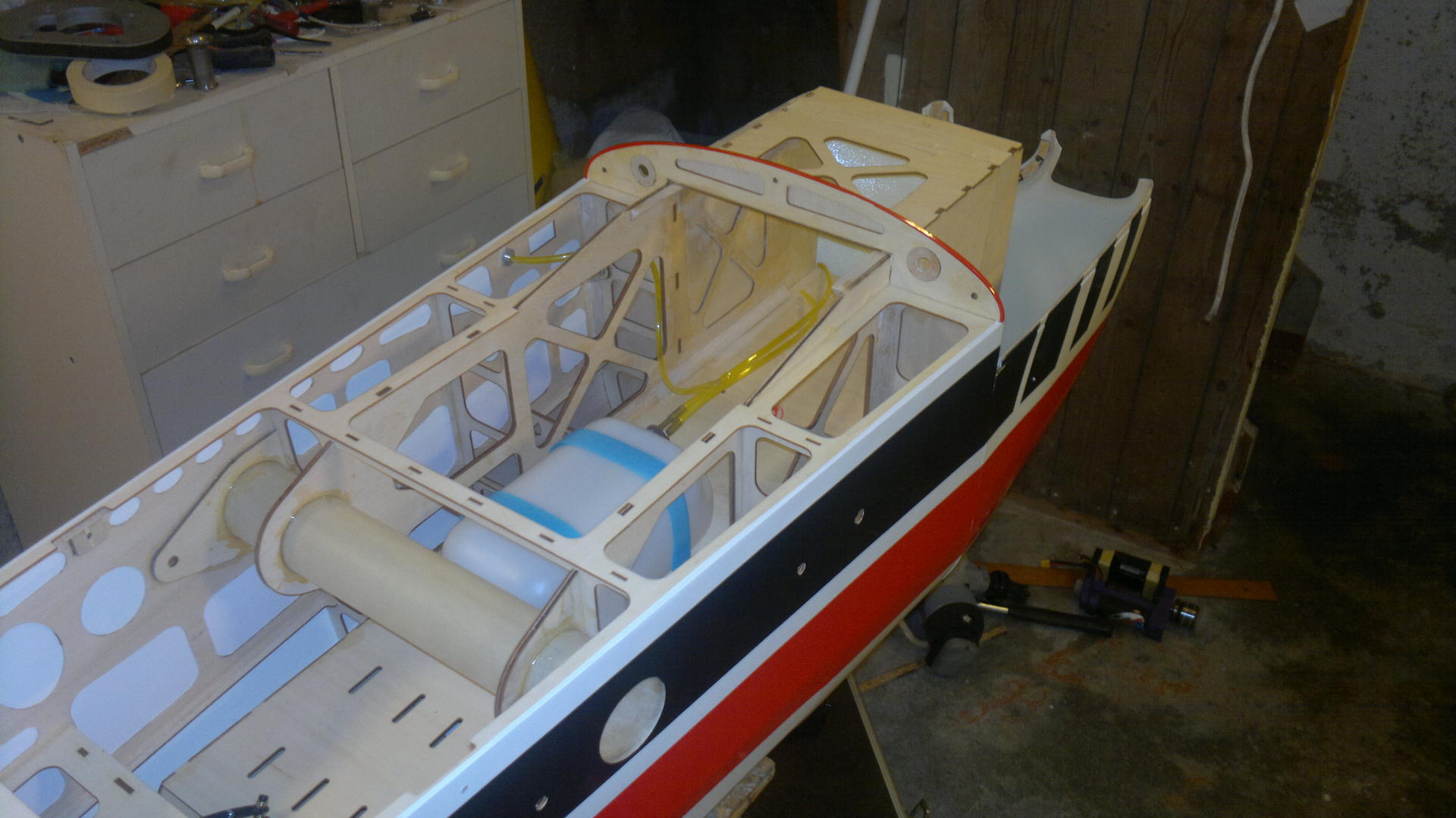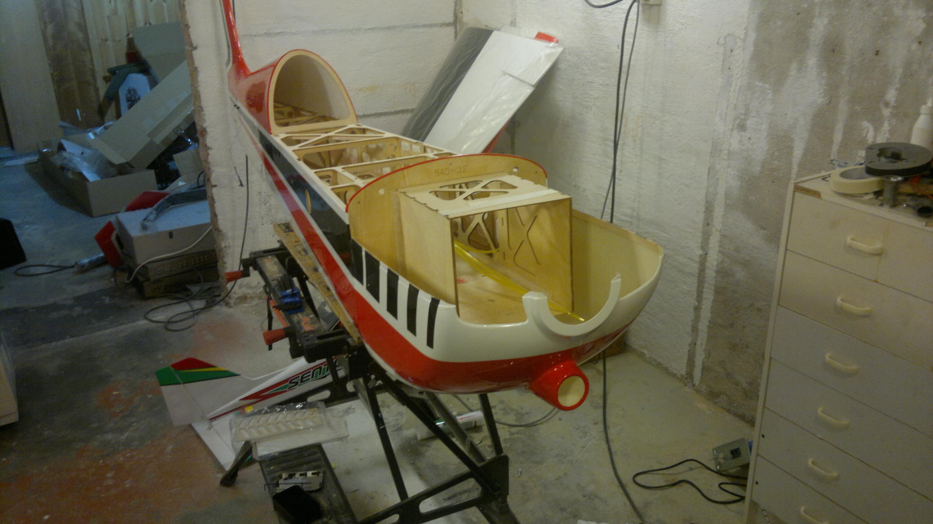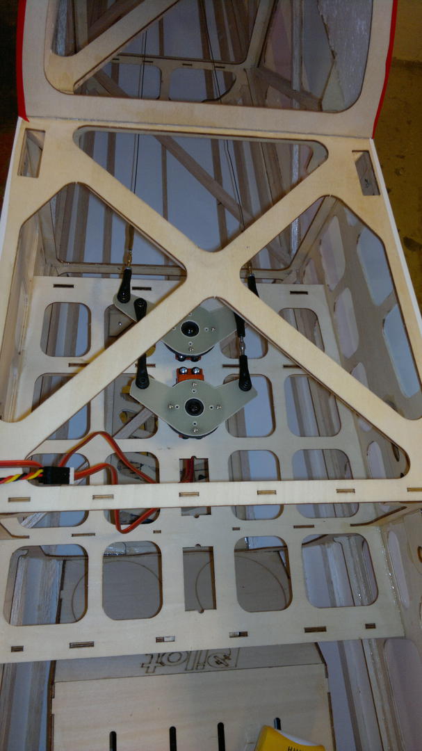 Da var sideror og servoer på plass. Understellsinnfestingen er noe jeg ikke er helt fornøyd med. Der er der 4 6mm bolter med mutre som holder understellet. Men for å holde på disse mutrene må covlingen av. Noe som er utrolig tungvint om en vil ta av understellet under transport. Vurderer derfor å legge en treplate over aluminiums vinkelene inne i tunellen og bruke 6mm innslagsmutre i denne platen. Noen som har andre ideer?