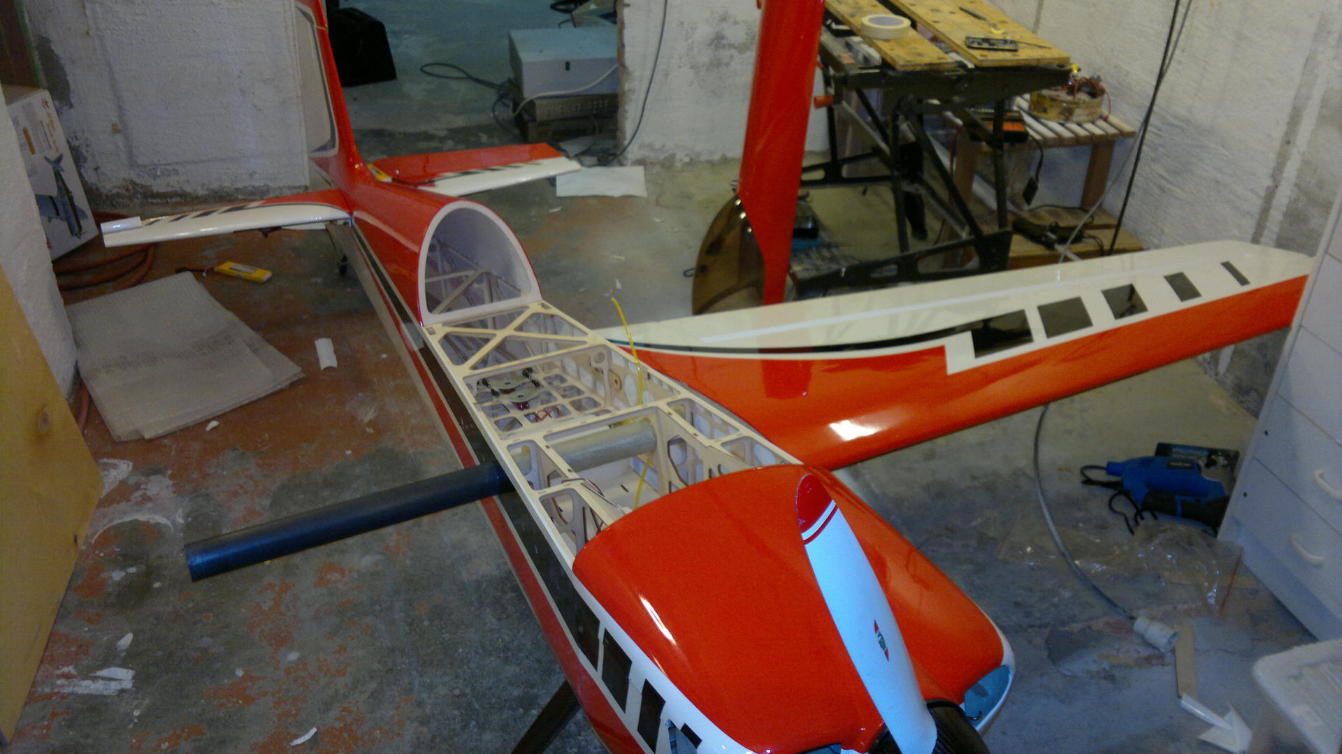 Nå ble jeg usikker på hva jeg skal gjøre. Selv med servoene flyttet bak alt av batterier helt bak i flyet og tanken bak vingerøret må jeg ha 800g balast i halen får å få den balansert.