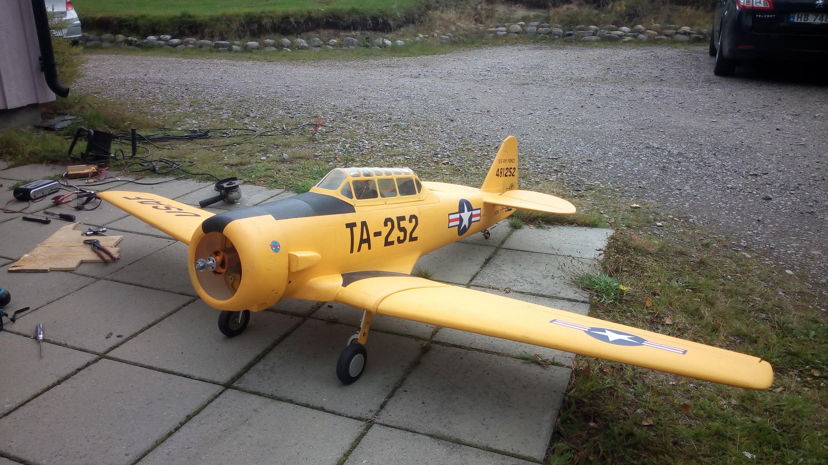 Kjøpt en brukt at6 med vingespenn på 2135mm Den har glassfiber kropp og balsa vinger. midtseksjonen av vingen er støpt sammen med kroppen. Kjøpte den med servoer og luft understell, men uten motor. fikk beskjed om att den var flydd med en ngh gf38 + masse bly før. og det stemmer att den er tung i rumpa.