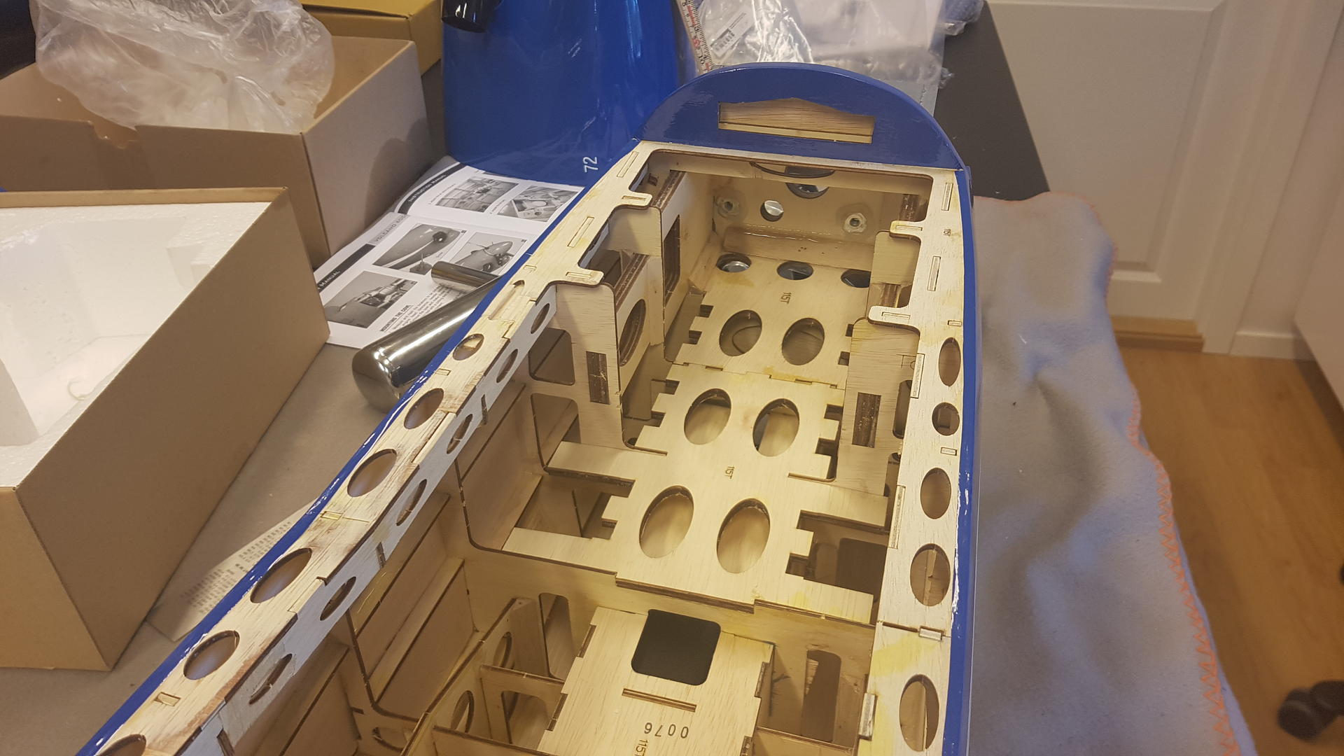 Fikk endelig inn en skikkelig byggedag sist lørdag så nå er det kommet en del på plass. Stabben er ferdig med alle servoer for høyde og sideror, videre fikk jeg på plass tank og neselegg med styring. Nå mangler jeg bare noen loddedeler til eksosen som må bestilles. Denne kommer til å få fri eksos da det rett og slett ikke er noen egnet plass for canister, gjør litt vondt, men håper Valachen gir en grei lyd totalt sett.5 PhotosLars NorbergComment