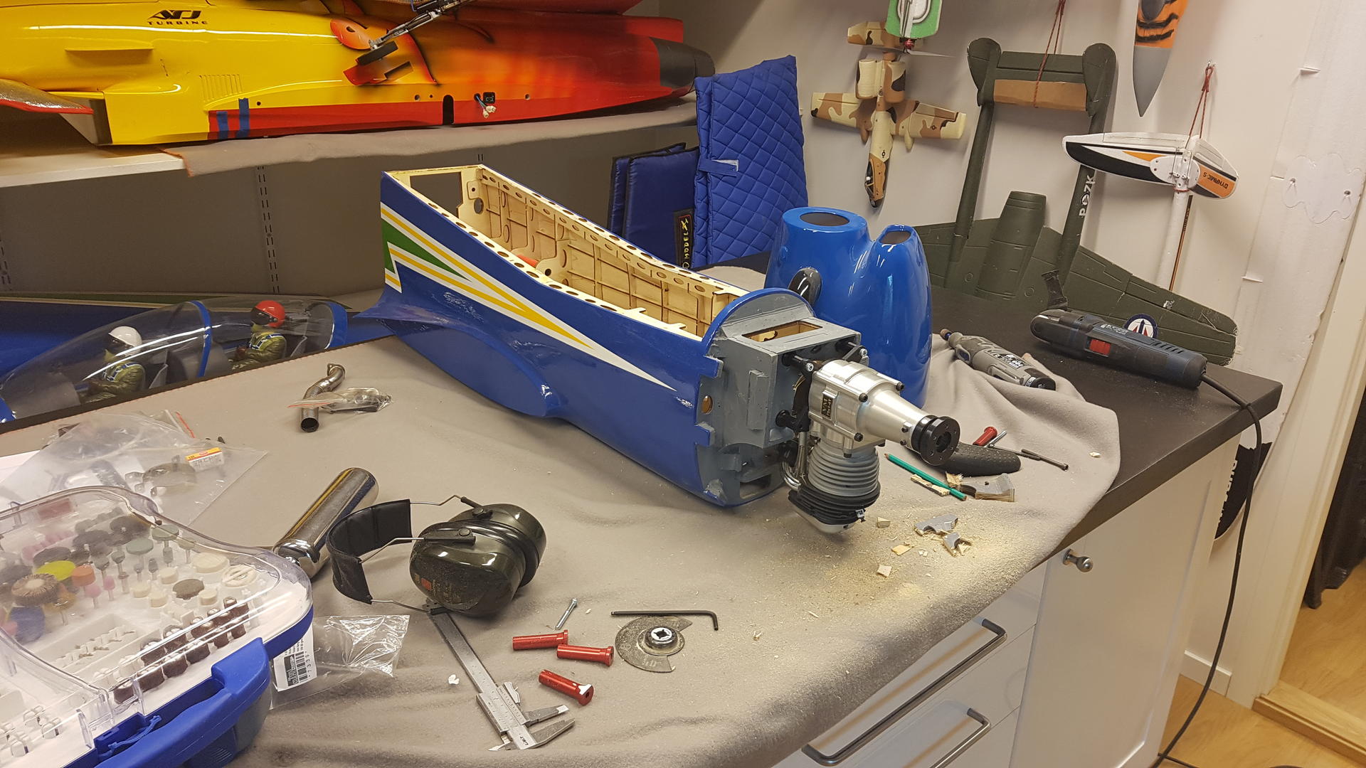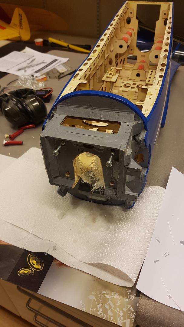 Det har stått litt stille pa husrenovering og lite tid i bua, men nå er motor devlis montert. Modellen har ferdig innslagsmuttere, men disse passer ikkehelt så må flyyer to av punktene. Ble skåret ut en del i firewallen så må forsterke litt rundt dette området. Endte med en løsning hvor jeg kuttet ut til bakdelen av motor og beholdt den originale plasseringen. Så må jeg kutte ned standoffsene litt.