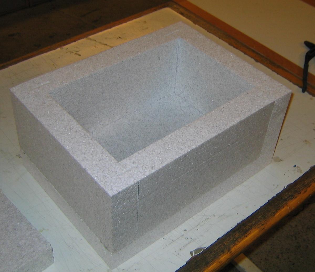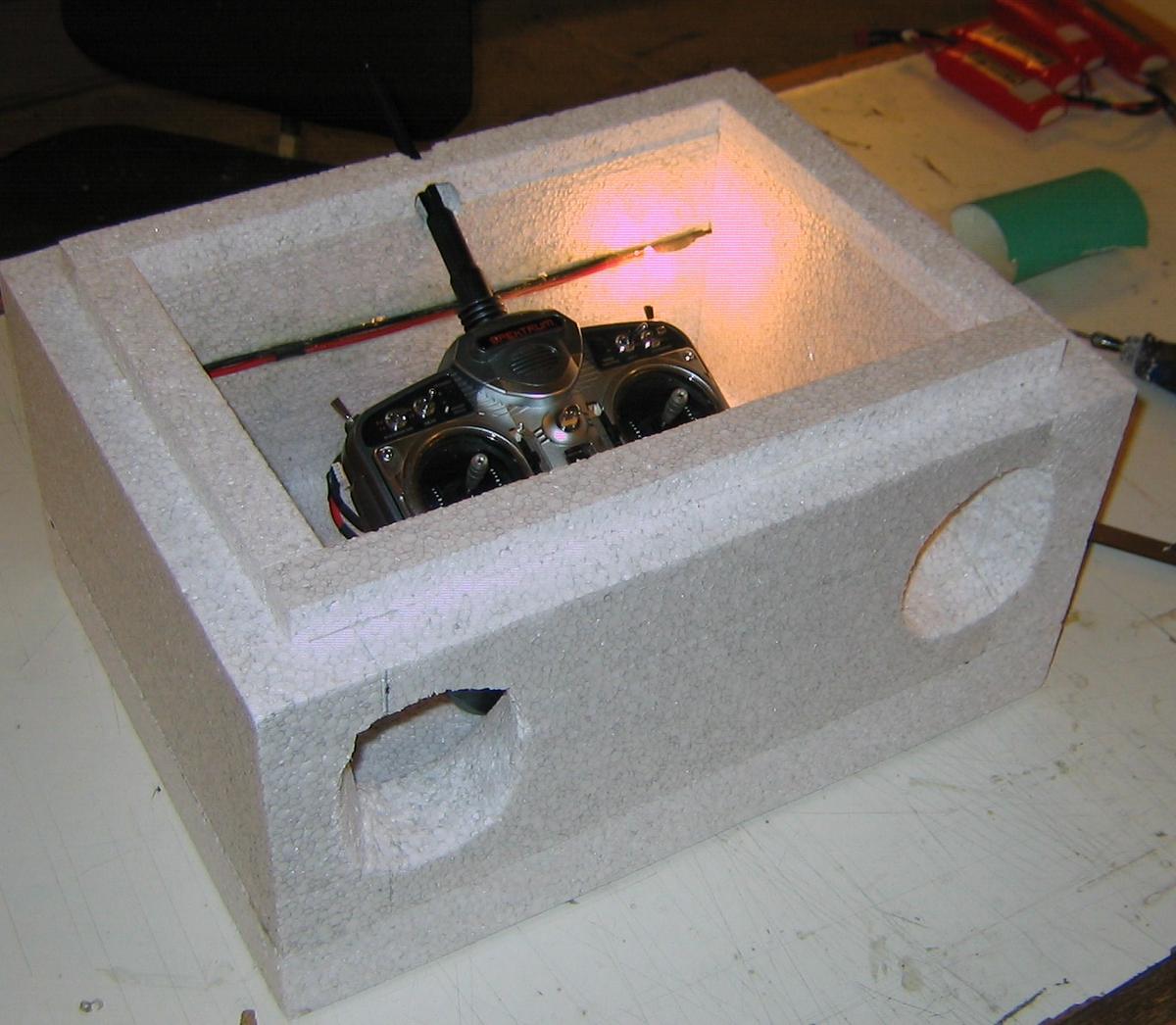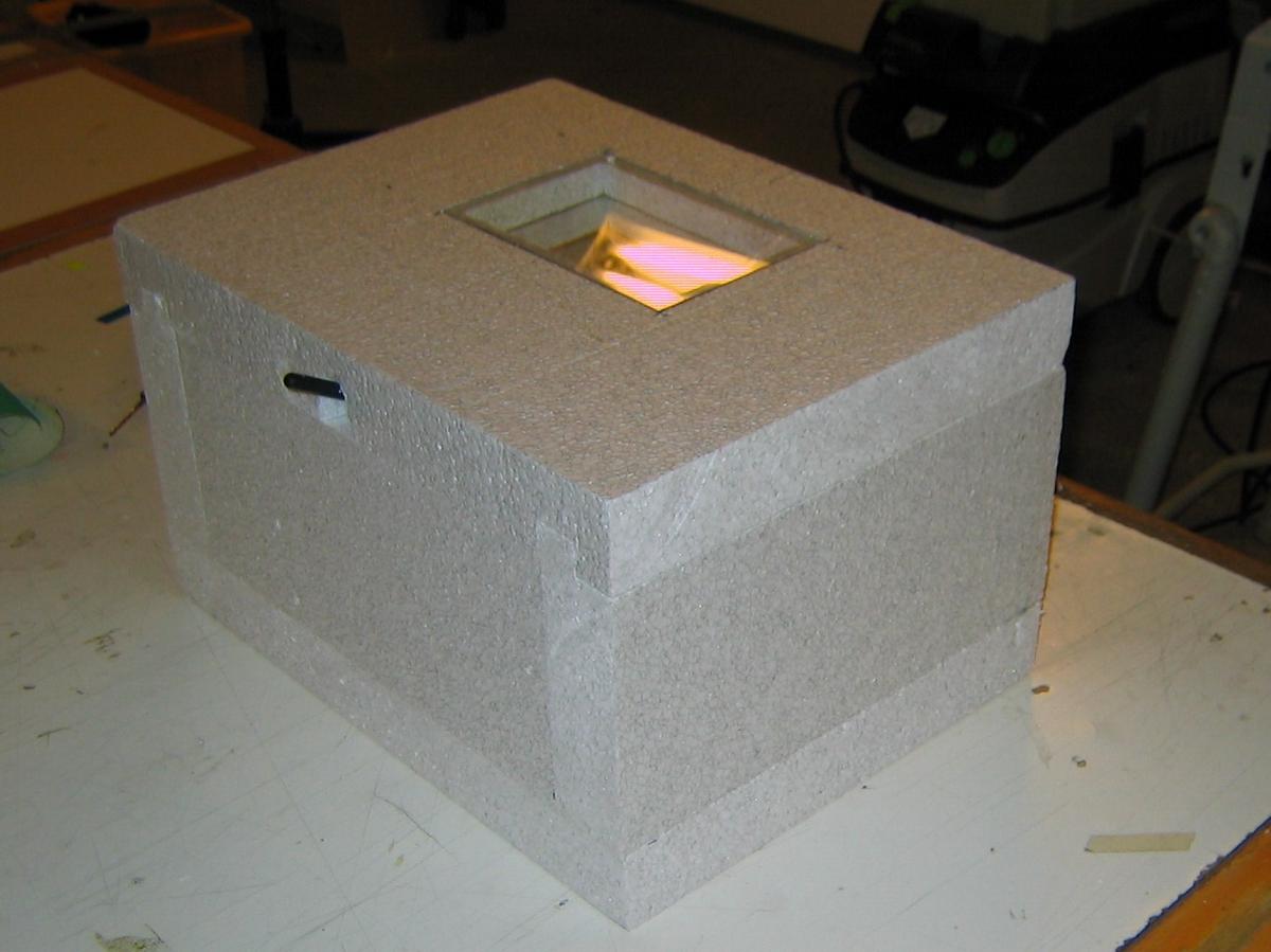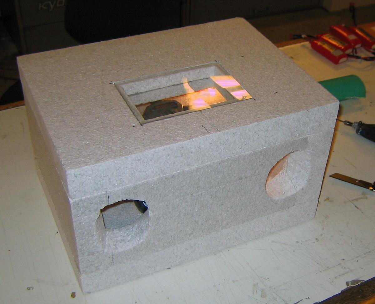 Brukte vanlig isopor denne gangen. Lett og godt isolerende. 5cm isopor i hele boksen. Tre lag plexi i vinduet. Skal bruke 2 10-watt pærer som fyring og 3-cell Lipo som drivkilde.