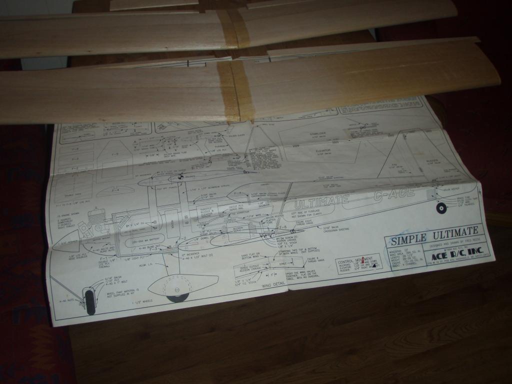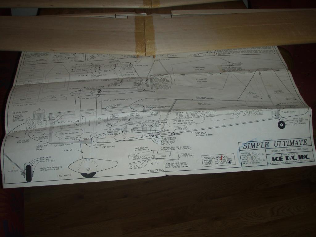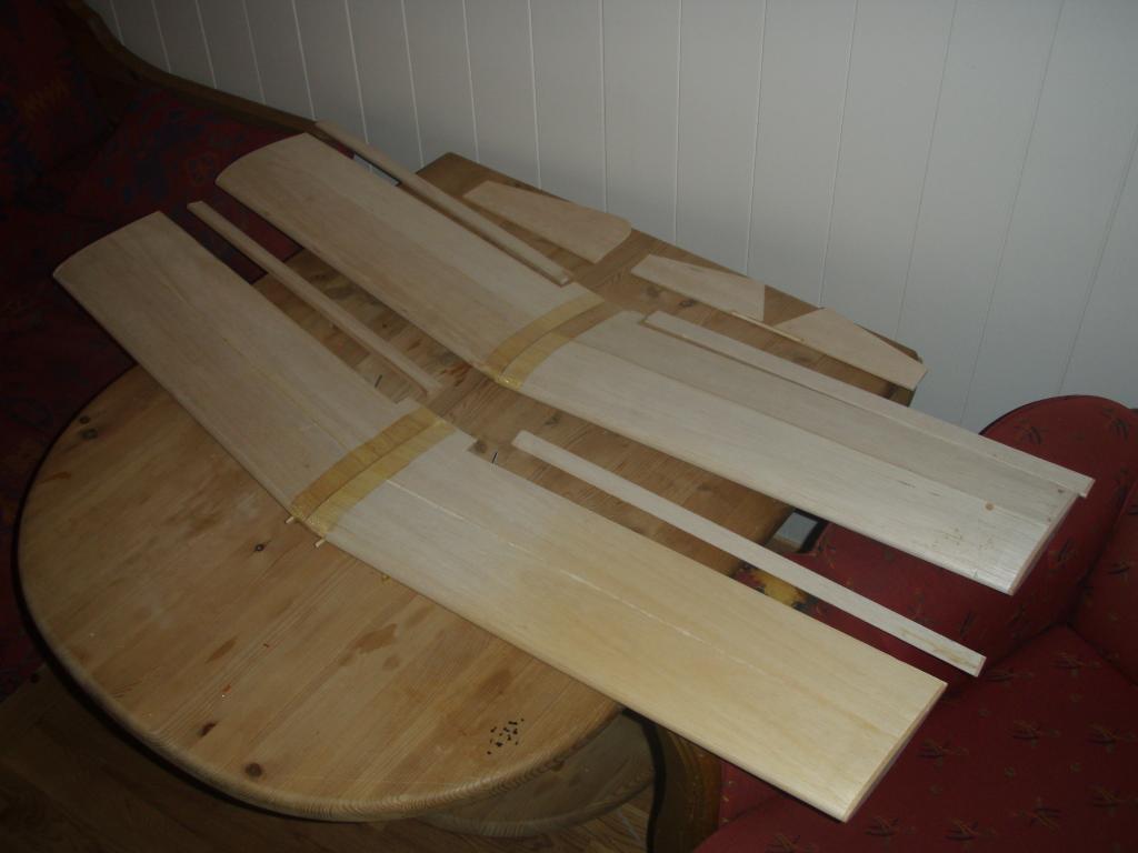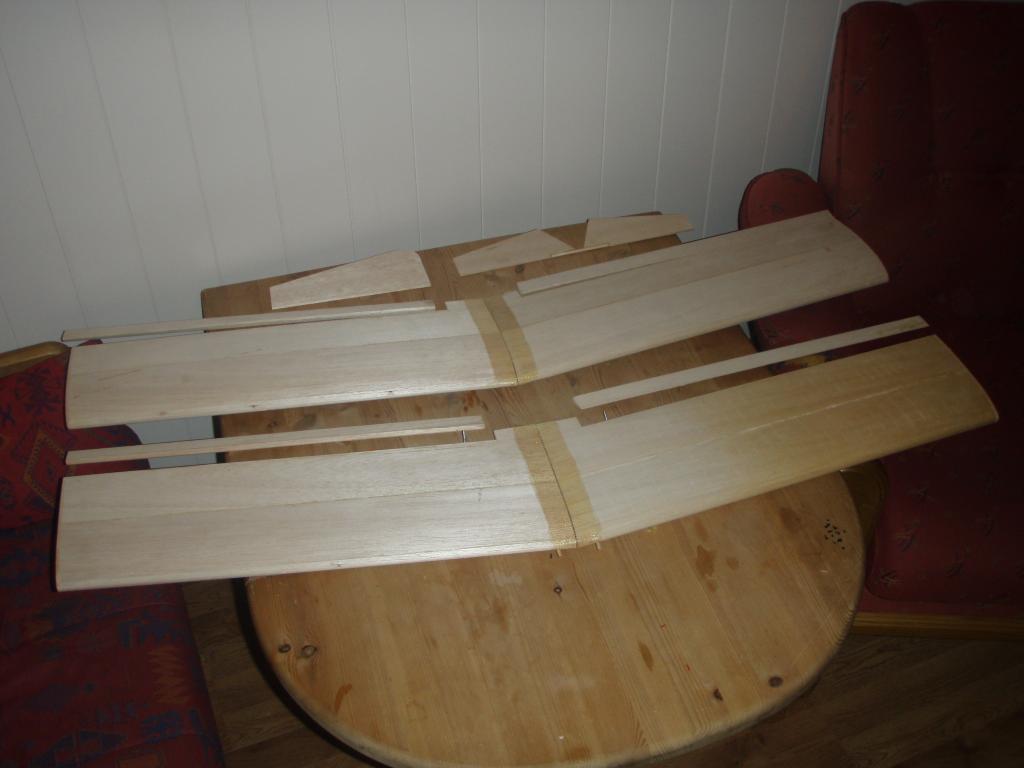 En ACE Simple ultimate som er forstørret med 30%. Jeg har ferdig plankede vinger, høyderor, sideror, og balanseror. Det som må bygges er kroppen, staben, og halefinnen. Vingespenn er forøvrig ca. 110cm.
