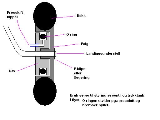 Tror jet-gutta bruker luftoppererte bremser. En trommel med en o-ring inni. Så setter man lufttrykk bak o-ringen og den presser i sin tur på trommelen i hjulet og hjulet bremser.