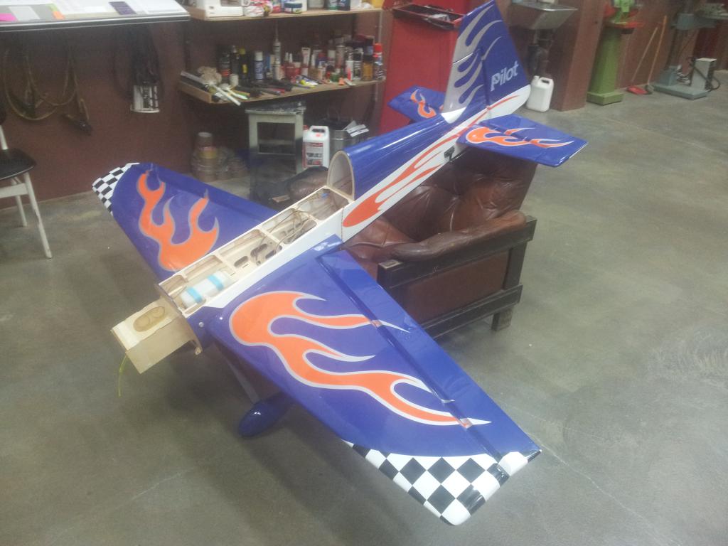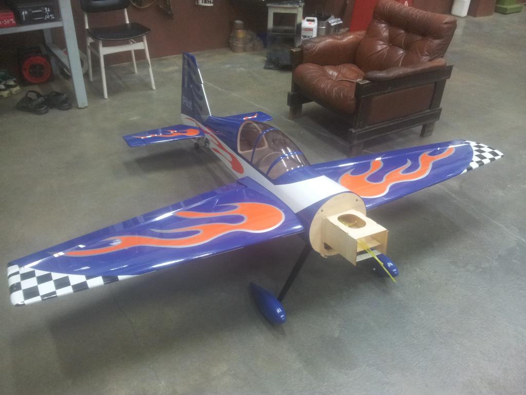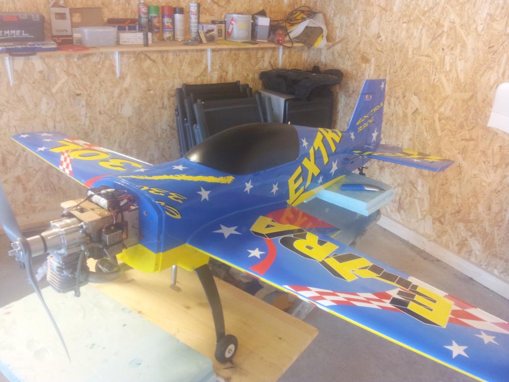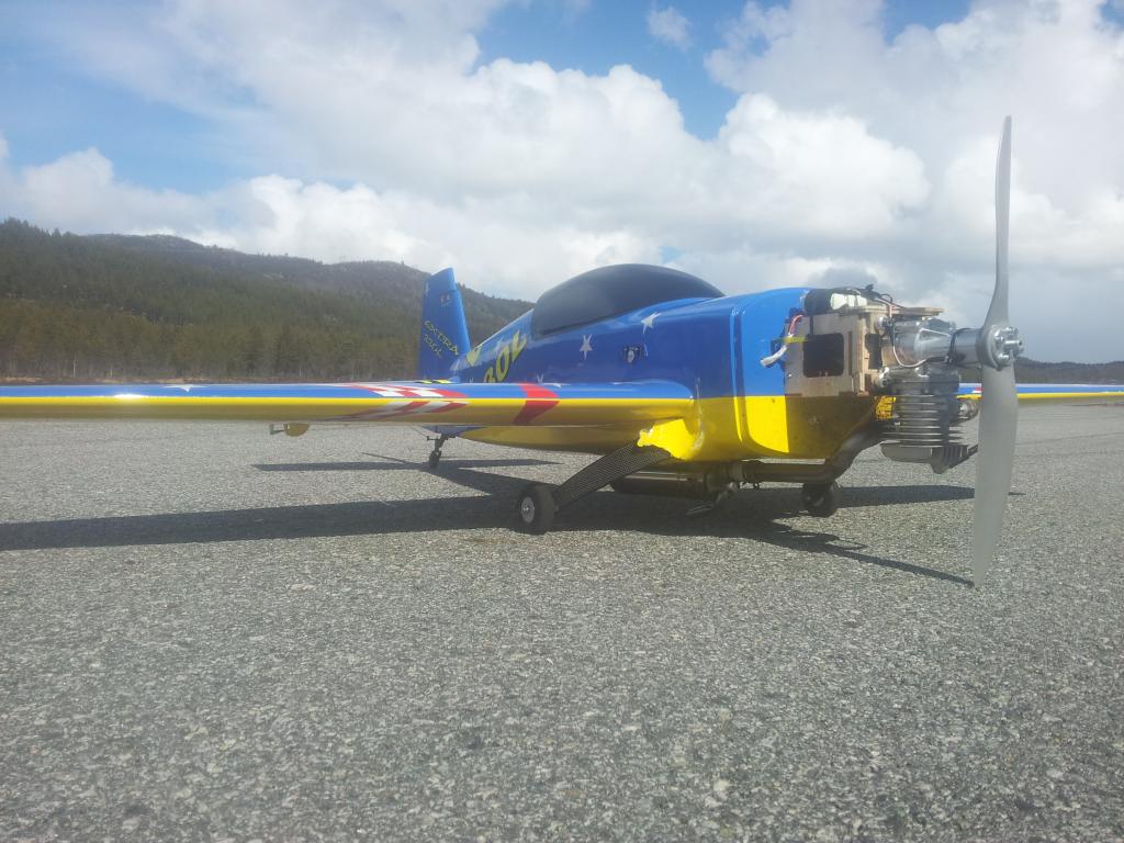 -I mellomtiden var jeg på besøk hos min bror som også er kraftig bitt av flysyken, og siden jeg var midlertidig flyløs (orker ikke mer glowsøl og styr med startere og batterier og andre ting, kun bensin heretter) endte jeg opp med å kjøpe en CMPro 330L Ekstra i glassfiber med en Turnigy 50cc motor, fikk den meget billig. Et greit fly, men ingen acrokjerre. Etter noen turer med dette ble det en litt hard landing og glassfiberen rundt understellet røk. Med Extra'n inne for nødreperasjon ble Revolveren hentet frem igjen. Alt fungerte helt topp, men etter mye leking og etterhvert ren idioti endte det i bakken på full gass. Kompisen min (som handler enda mer impusivt enn meg), hadde boden full av gamle fly som han har kjøpt brukt og aldri flydd. Disse var stort sett komplette med servoer, så det var bare å sette inn mottager og motor. Jeg gikk for en 40size Extra som fikk OS 72 motoren. Noe fremtung, men ingen krise. Dagen etter var det full fart på stripa, men flyet fløy så dårlig at seriøsitets-nivået sank dramatisk. Ikke overaskende endte også dette flyet i asfalten, denne gangen så brutalt at motoren også gikk heden. Vrakdeler i en sirkel på 25m. Da er jeg ferdig med glow.