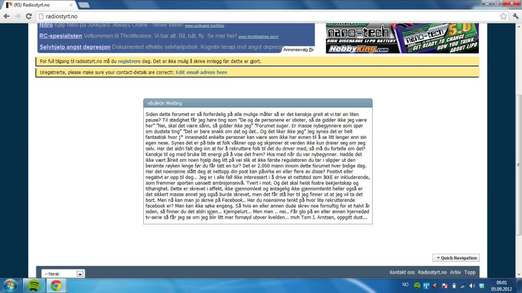 Reknar med at det skjer meir bak kulissene enn det som nødvendigvis kjem til uttrykk direkte i diskusjonstrådane på forumet. Tom har vel hatt ein grunn til å gjere dette, utan at han nødvendigvis treng å utdjupe det her. Forøvrig var radiostyrt.no nede med samme driftsmelding, så det er nok mykje samme kultur som er ute og går.