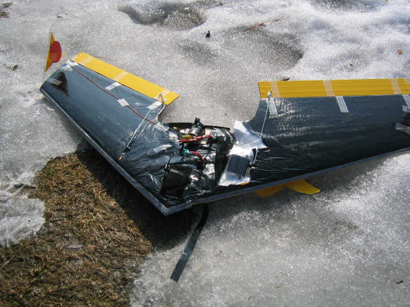 Bildene viser skade etter bakkekontakt loddrett fra 30m for full maskin. Denne vingen fløy like godt etter en 15min reperasjon med glassfiber-tape....