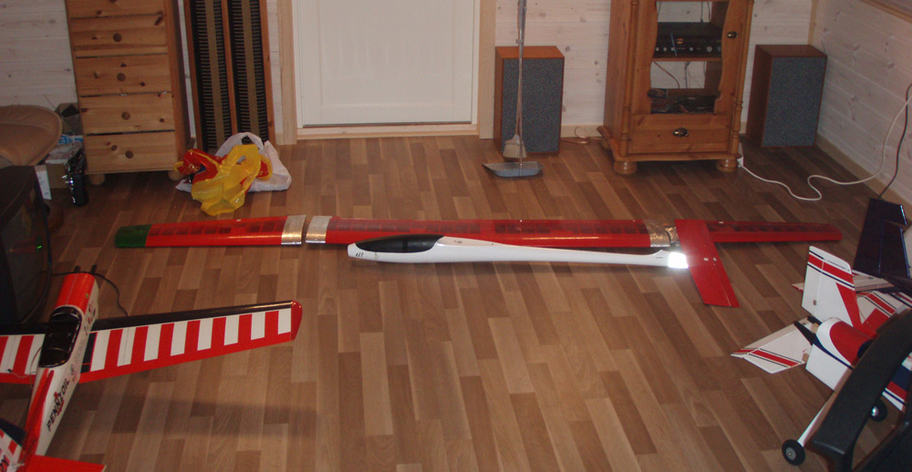 Det veier ca 1250 gram(med servoer, uten batteri/motor)