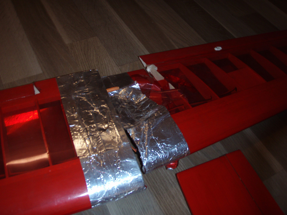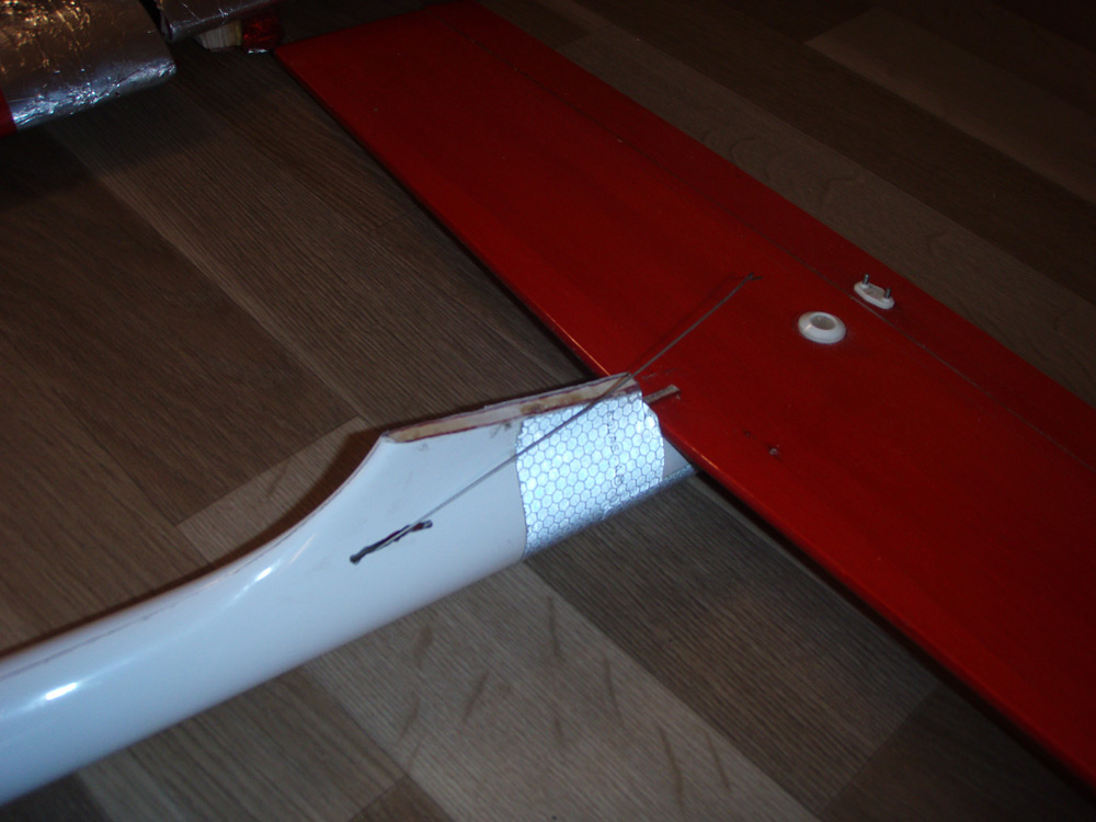 Vingen på dette flyet er tredelt. Men liker ikkje løsningen de blir festet sammen. Her er det bare brukt korte treplugger som går inn i vingedelene. Syns dette virker noe utrygt. Så eg vurderer å bare lime inn et karbonrør i kver ytre vingedel, i tillegg til de gamle trepluggene. Eller har dere forslag til andre løsninger som er kanskje er tryggere?