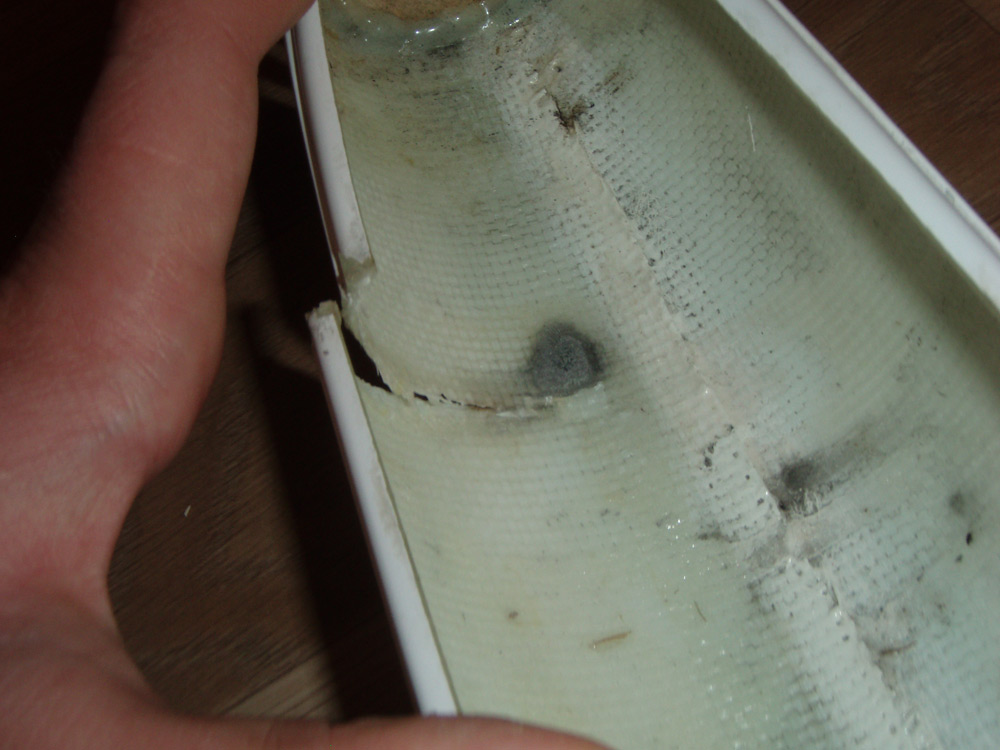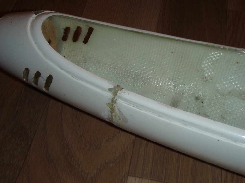 Den har fått en stor sprekk i glassfiberkroppen. Denne lurer eg på korleis eg skal forsterke/tette.