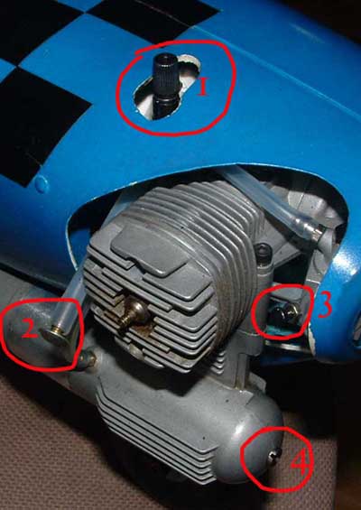 (kun flydd el fly)Den skal være innkjørt og justert. Klikker du på bilde ser du nummerering( 1 til 4) Fint om du/dere kan si meg hva de forskjellige justeringene gjør. 1 har vel noe med tillgang av fuel?, 2 noe med lufting?, 3 tomgangs skru? 4??. En annen ting er hvor man fyller på fuel?? Vet dette høres dumt ut men har man ikke sett en motor så....Starting av motor og vedlikehold har jeg sånn høvelig inne men hvordan stopper jeg den?