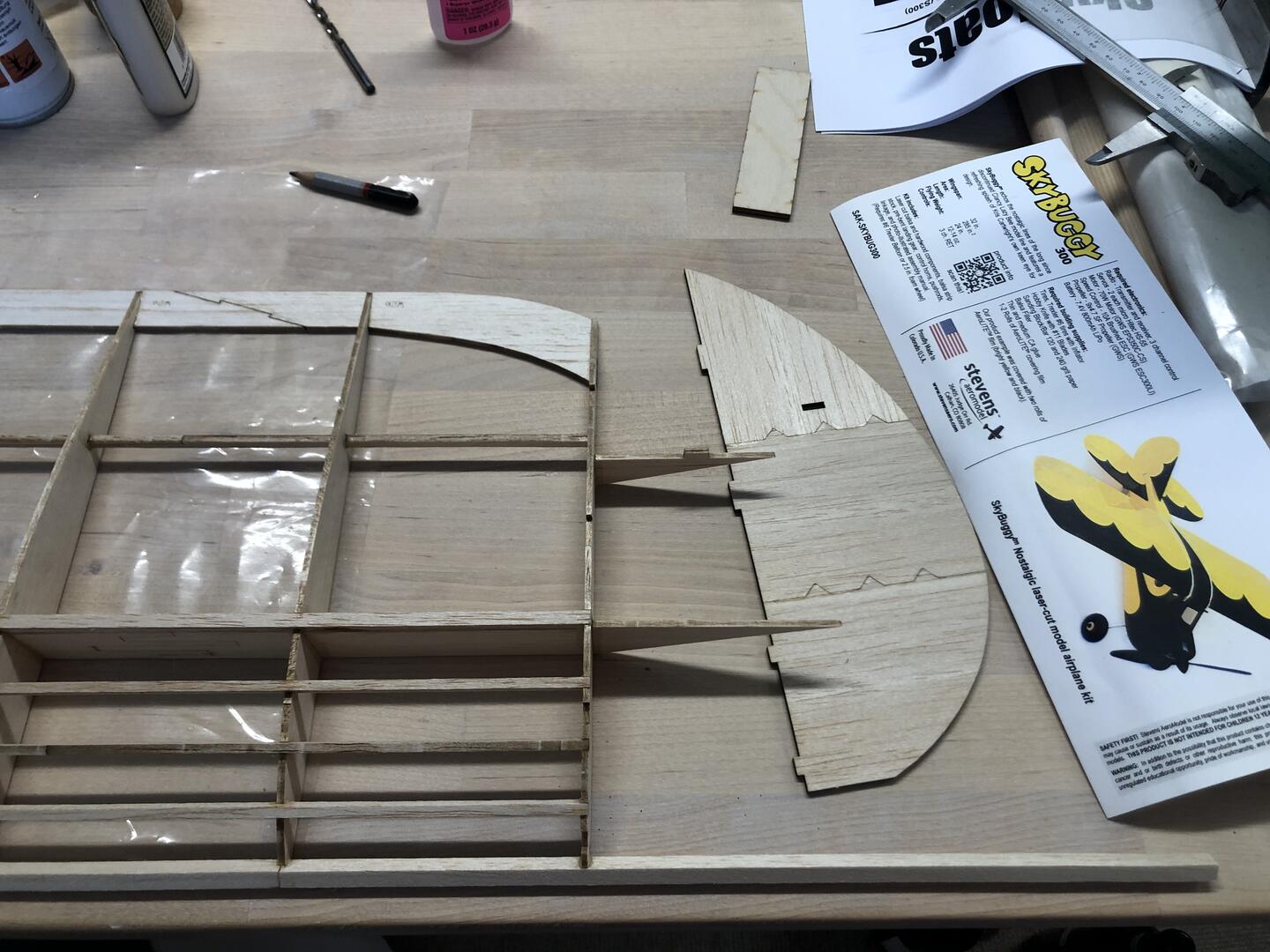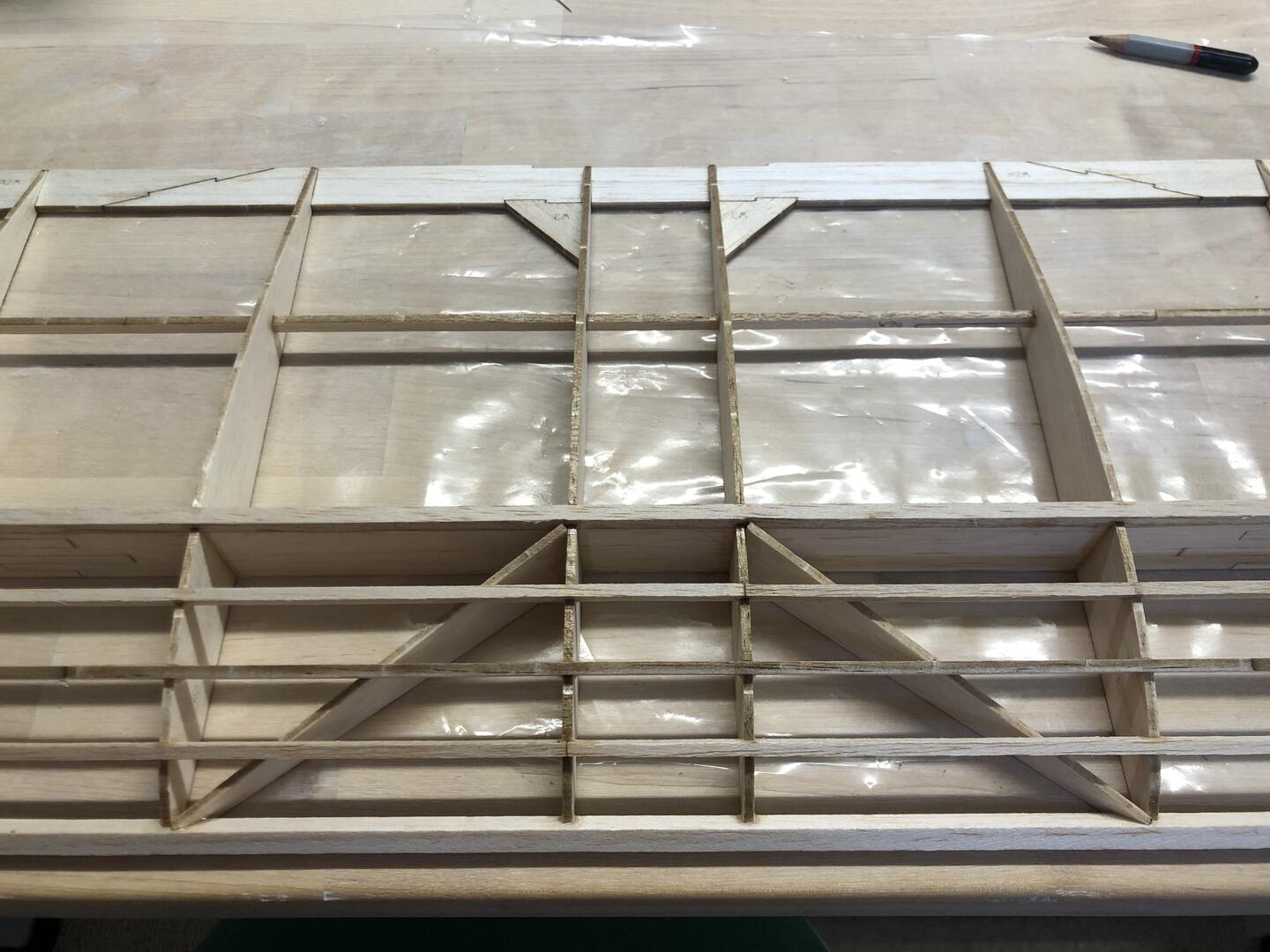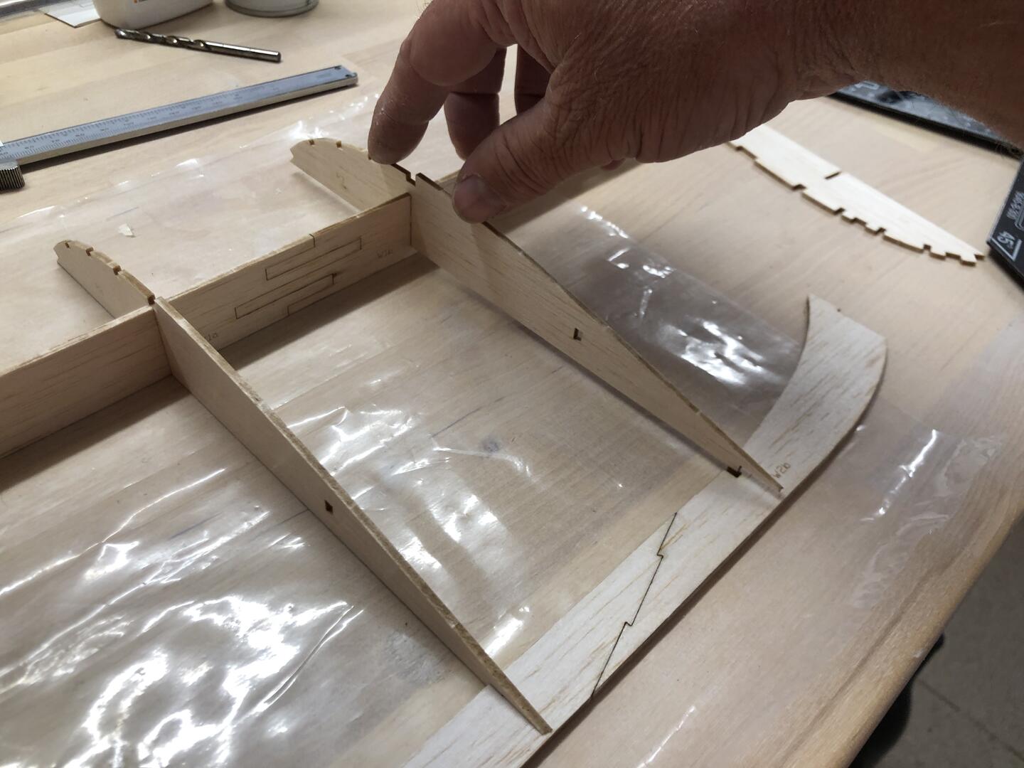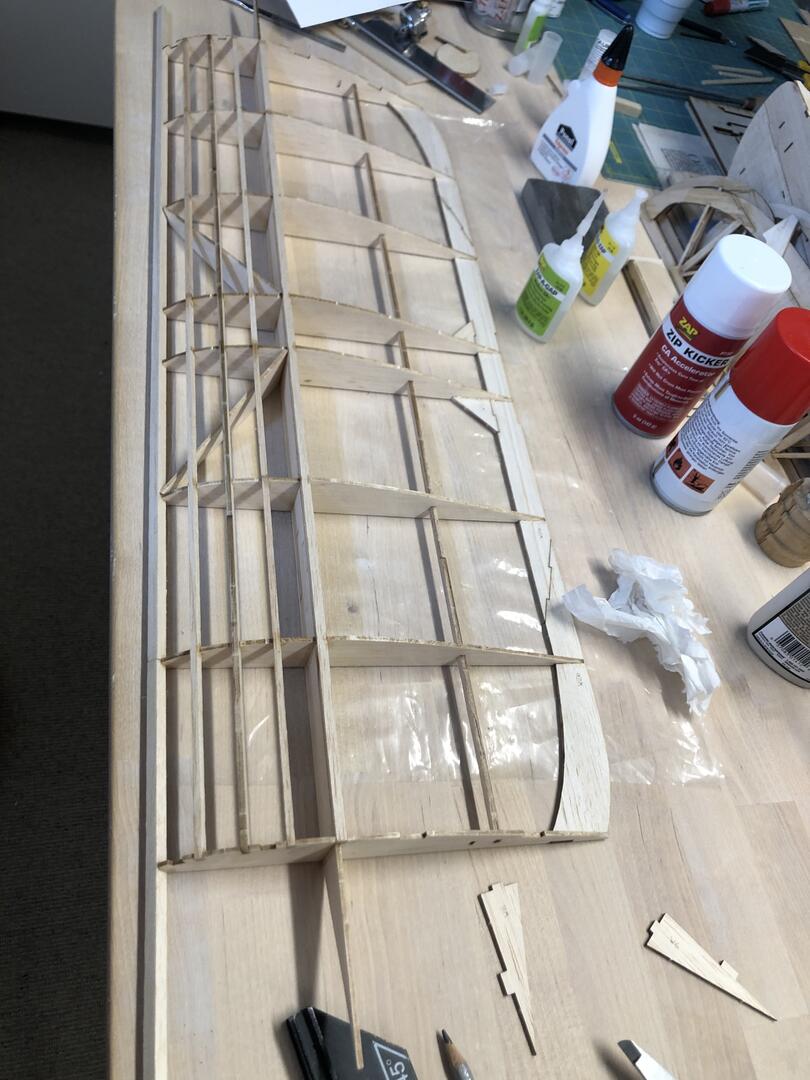 Vingetipper limt på , bakre bjelke er skjøvet inn med 100dels mm pasning og en tynn kryssfiner bit i bakkant ving, vingen festes med strikker. Neste punkt blir pussing og litt lakk på utsatte steder.
