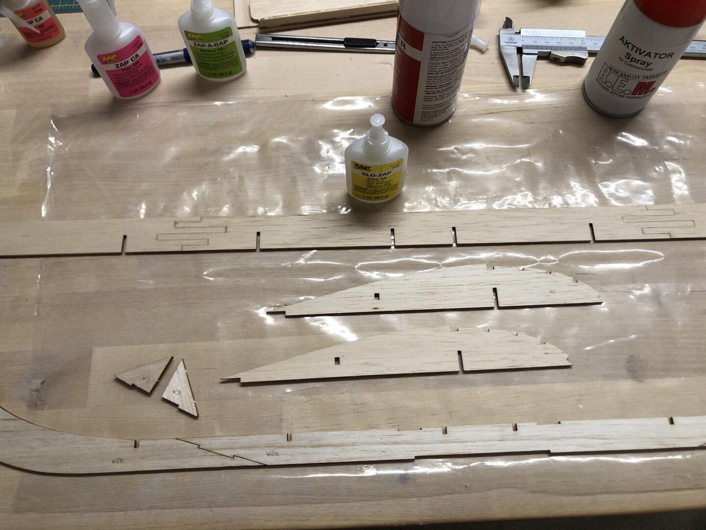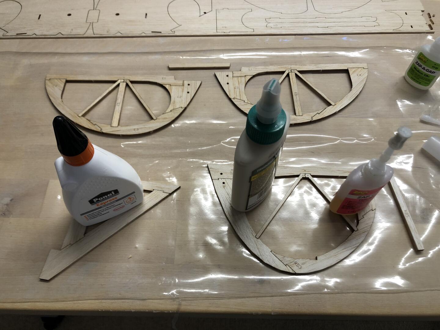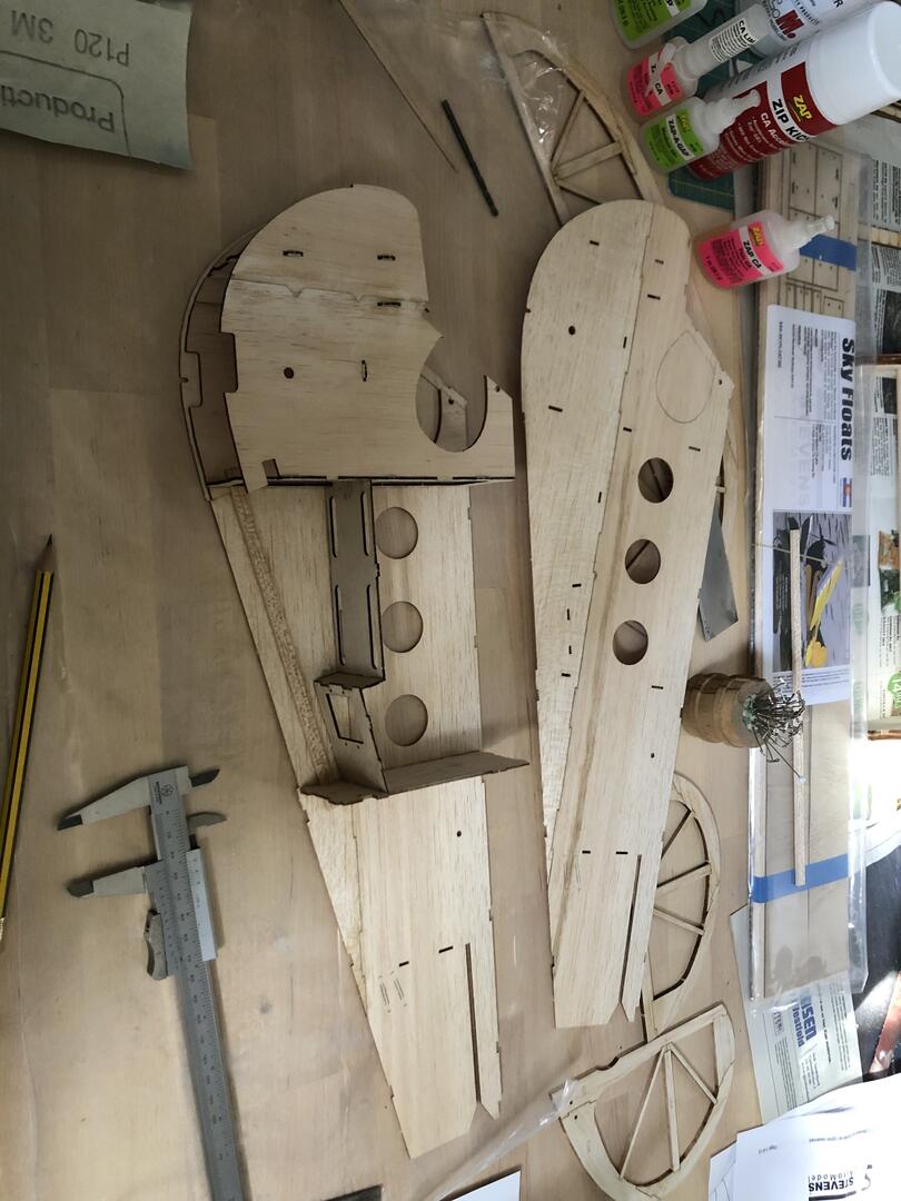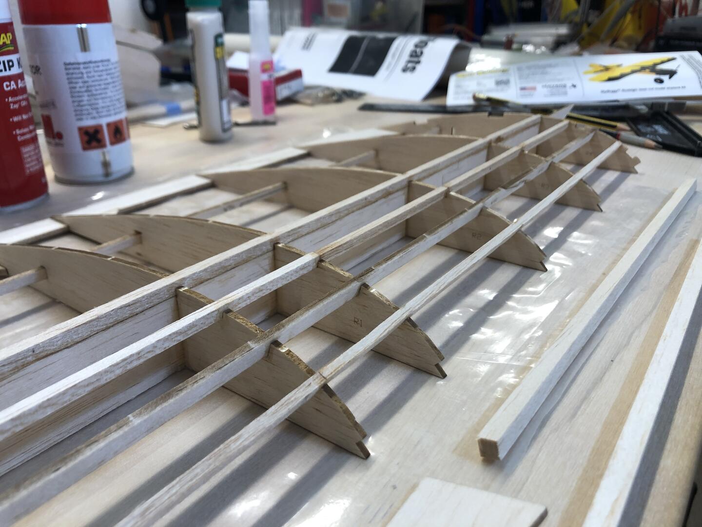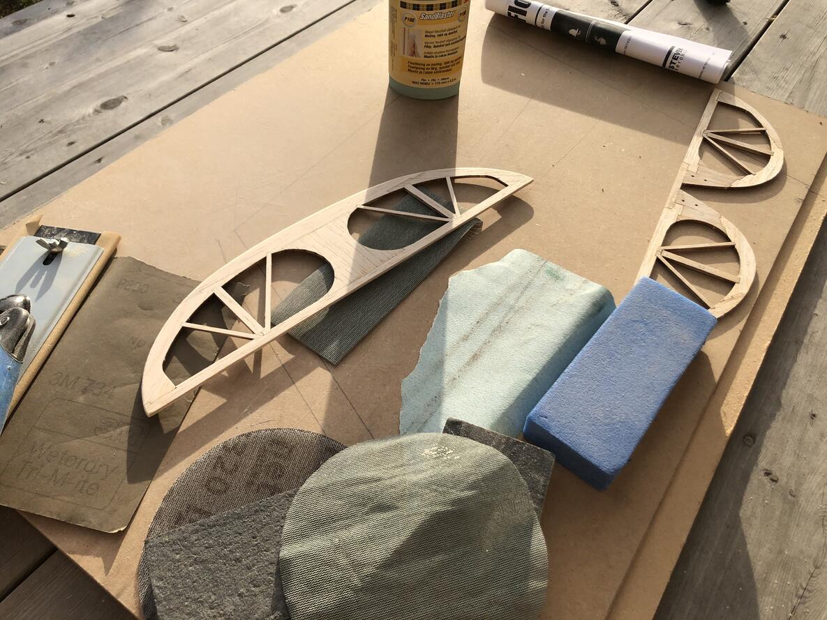 Vingetipper limt på , bakre bjelke er skjøvet inn med 100dels mm pasning og en tynn kryssfiner bit i bakkant ving, vingen festes med strikker. Neste punkt blir pussing og litt lakk på utsatte steder.