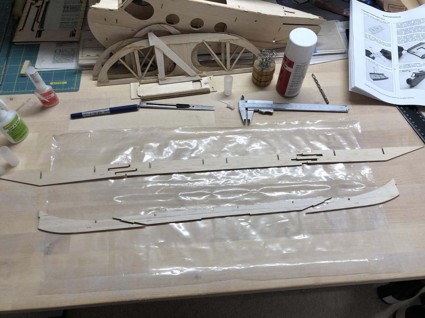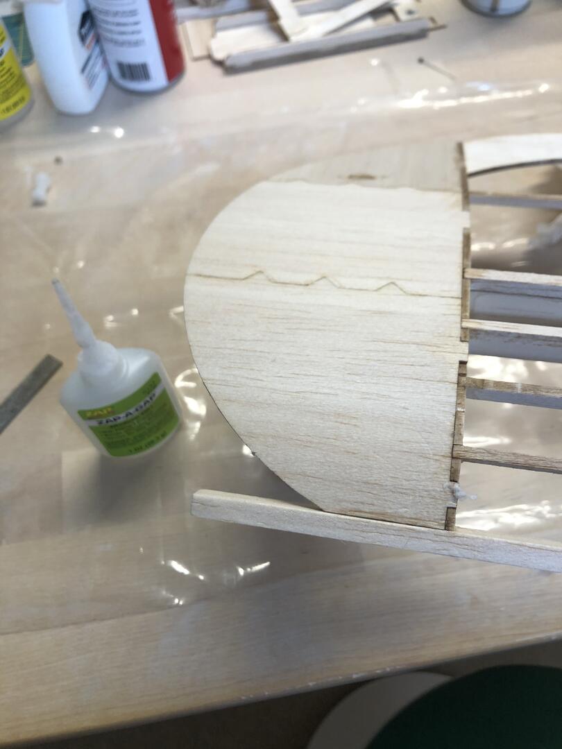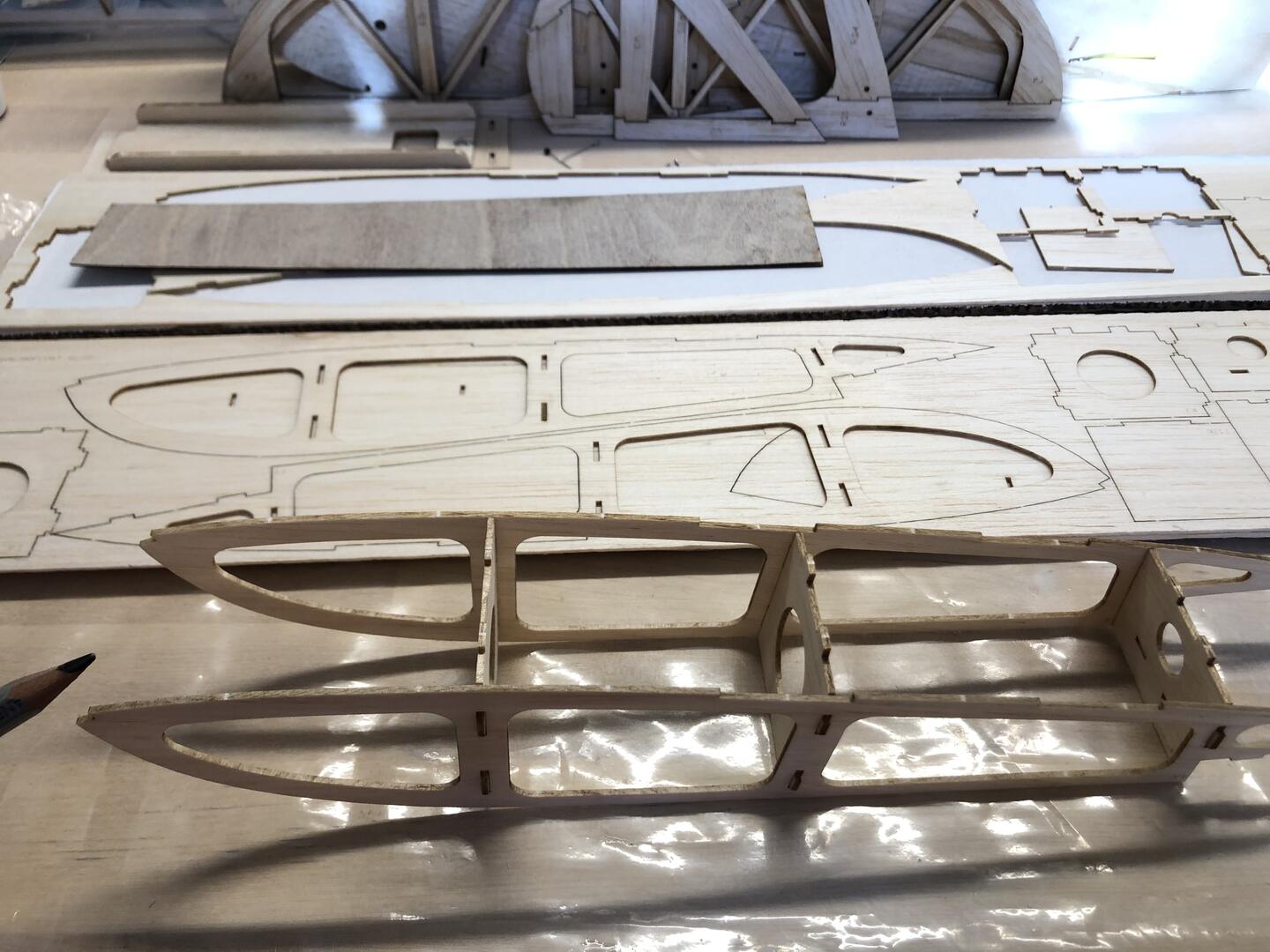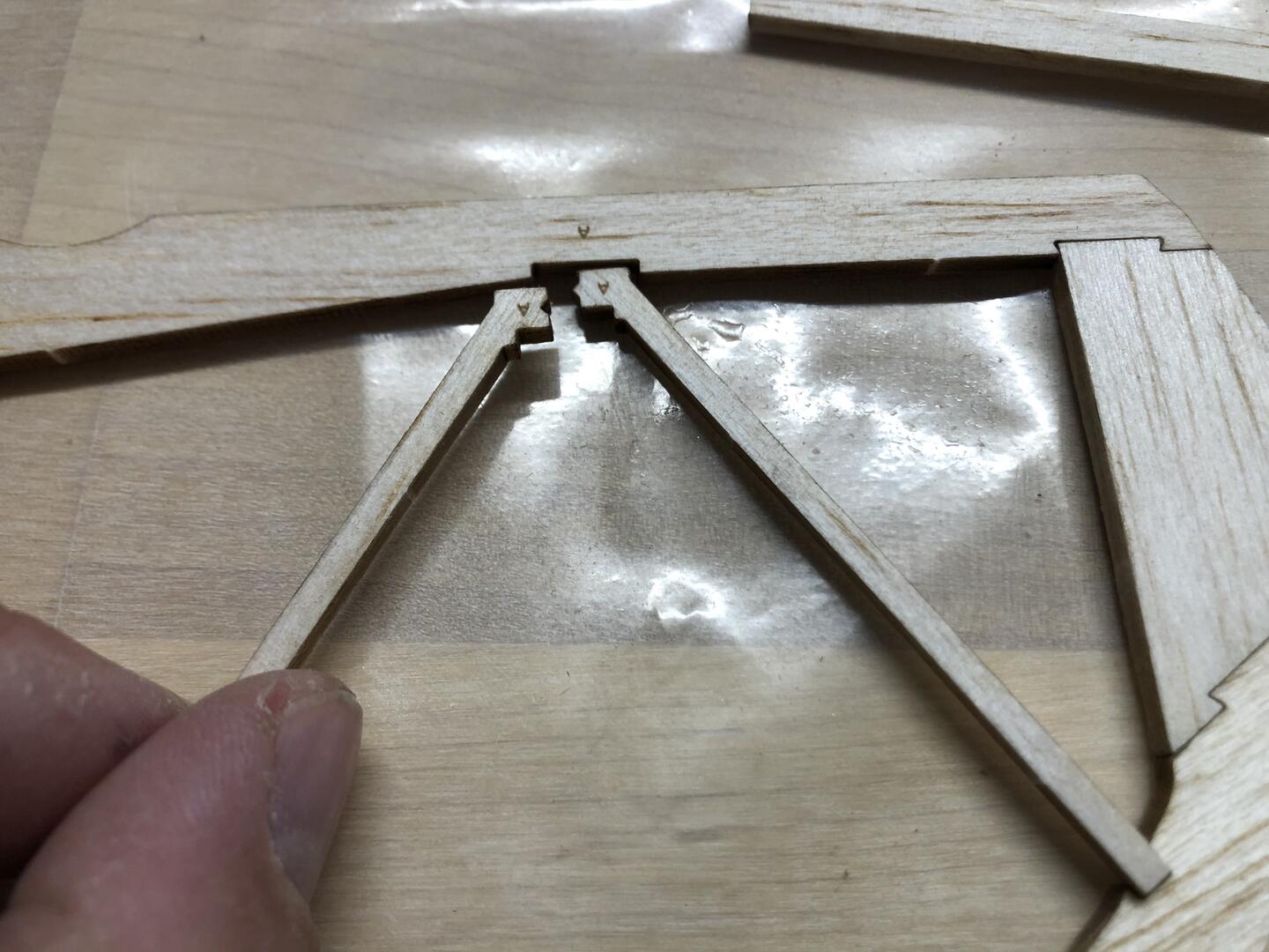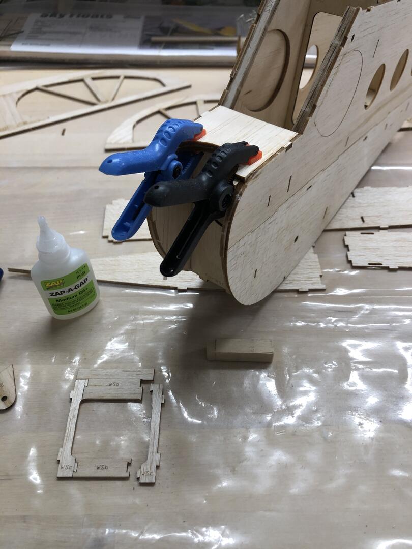 Vingetipper limt på , bakre bjelke er skjøvet inn med 100dels mm pasning og en tynn kryssfiner bit i bakkant ving, vingen festes med strikker. Neste punkt blir pussing og litt lakk på utsatte steder.