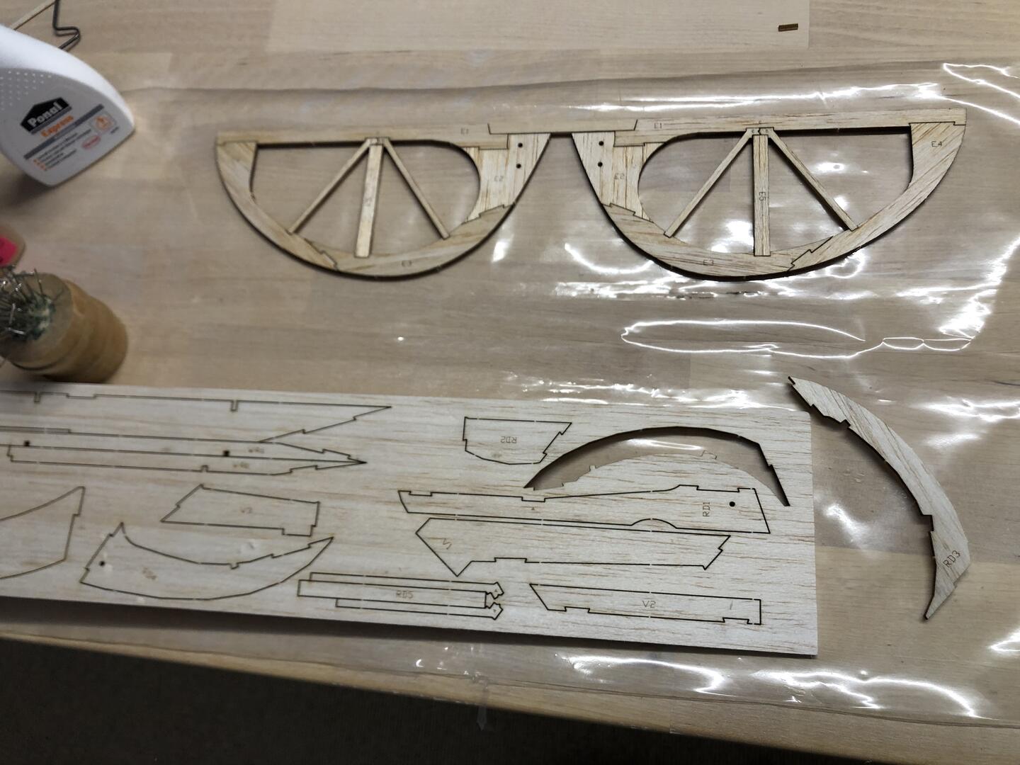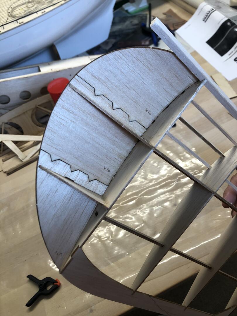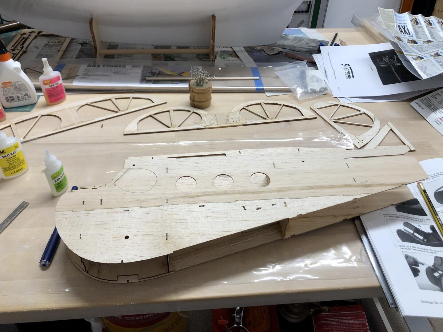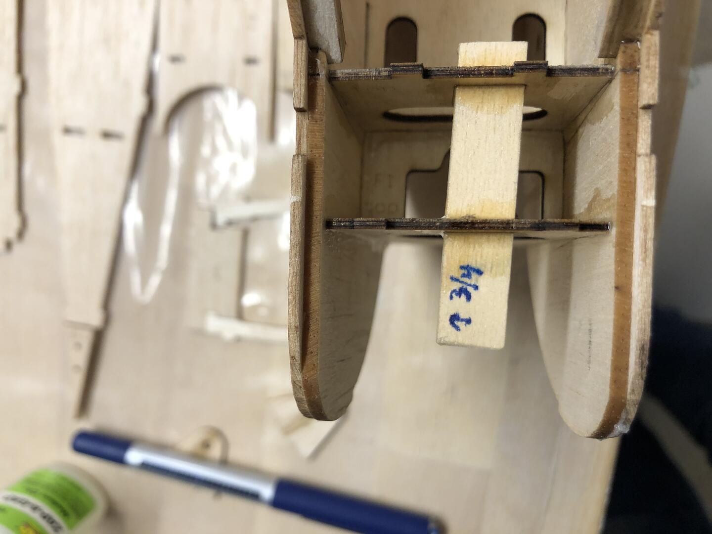 Vingetipper limt på , bakre bjelke er skjøvet inn med 100dels mm pasning og en tynn kryssfiner bit i bakkant ving, vingen festes med strikker. Neste punkt blir pussing og litt lakk på utsatte steder.