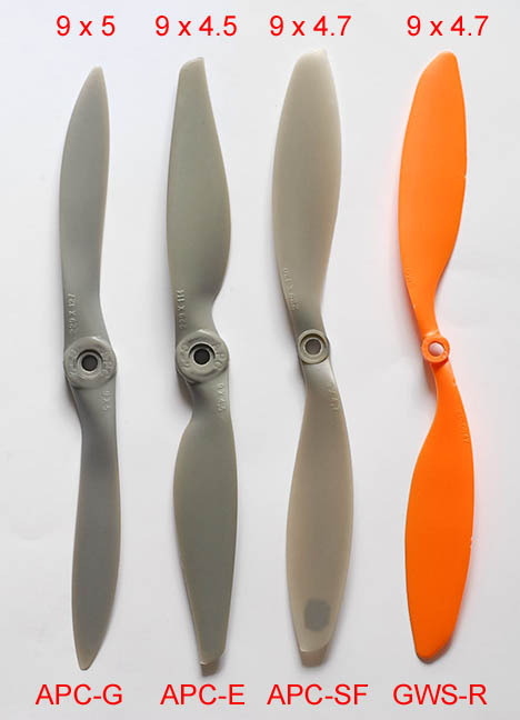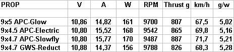 I was advocate for APC-E props that are my reference props when doing lab tests. I have a feeling they are optimal solution for motors turning 5000 to 10000 RPM and besides, they seem to be lighter than glow APC's.