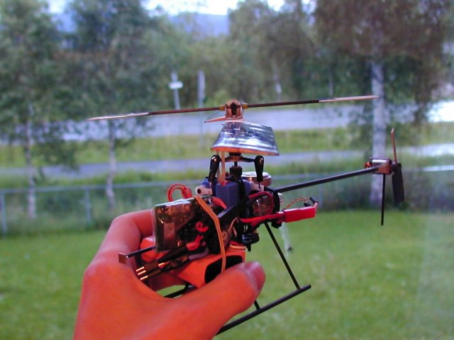 Jeg mangler to ting for å fly. Batteriene jeg har er for store, og så mangler jeg gyro og revo mikser da jeg ikke har heliradio. Jeg har kjøpt et brukt lettet Ikarus Piccoboard som er på vei fra USA nå (ble sendt på onsdag) og jeg håper jeg får det tidlig i neste uke da jeg skal reise bort på onsdag. Jeg har jo et sånt kort i Apache'n min men jeg vil helst ikke kannibalisere.