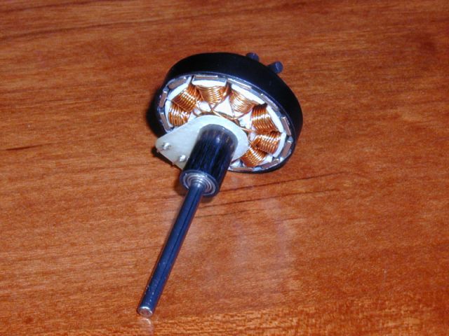 Jeg viklet denne motoren med 26 runder med 0.4 mm lakkbelagt kobbertråd i stjerne. Den tråden kjøpte jeg hos www.elfa.se sammen med en rull med 0.3 mm og 0.5 mm. Man må bruke så tykk tråd som man klarer å vikle med, men jo høyere antall viklinger jo trangere blir det og da må man bruke tynnere tråd.