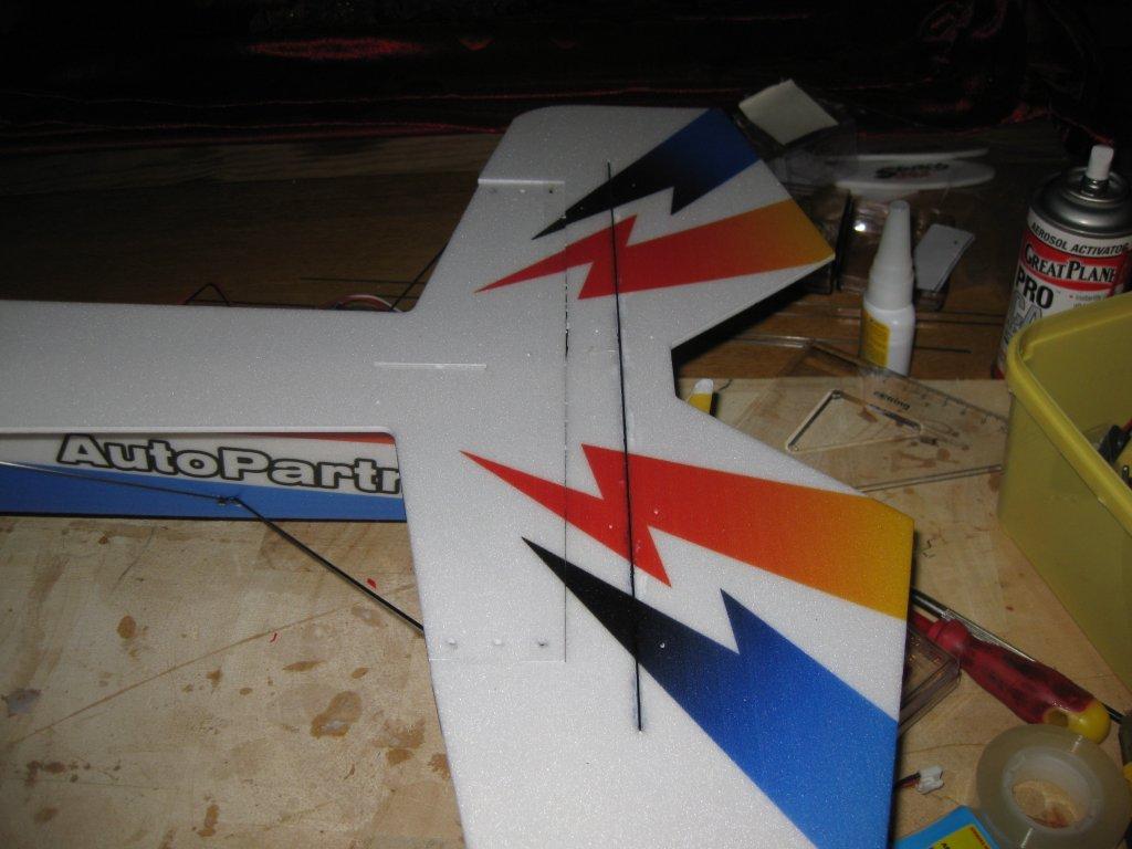 skar til hengsle-kanten på rorflater, slik at kanten ble 45 gr. brukte 30mm bred blank vanlig tape til hengsling. sitter greit foreløpig, men blir kanskje lit dårlig ettervert men vi får teste, hadde ikke noe annet.